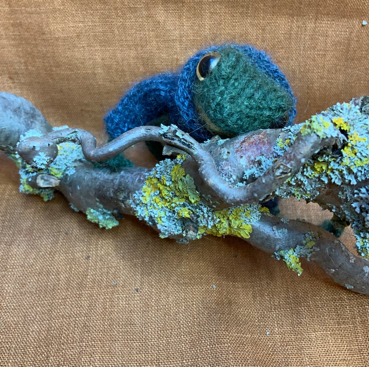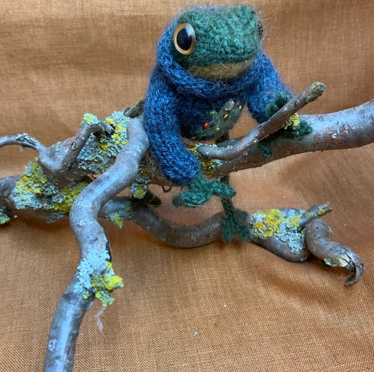 I bought some beautiful dark green yarn having found a very dark green frog in my garden a few weeks back. The warm autumn weather had brought him out and he was so dark. Having knitted this little one, I just fell in love with him and have actually found him quite a wrench to part with. He looks so earnest and a little bit timid. I hope he finds a loving home.