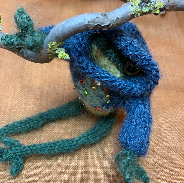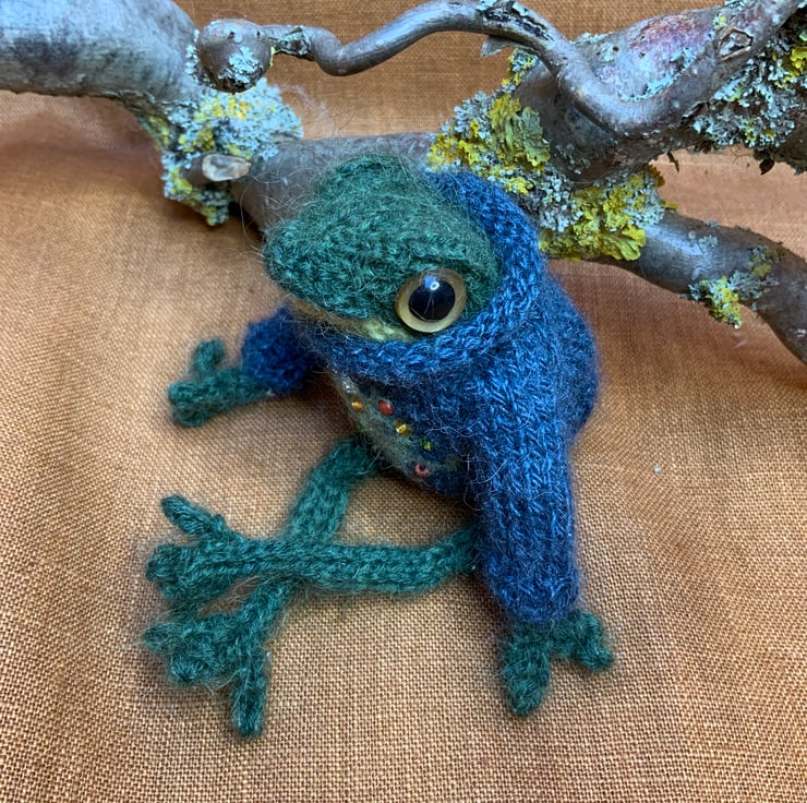 Hand knitted by me from a dot pebbles pattern, this little frog is knitted using a mix of Alpaca and Mohair Kid Silk yarns and is filled with sheep wool.