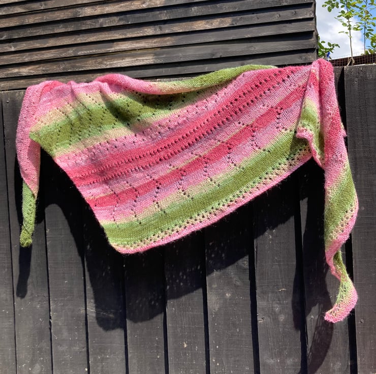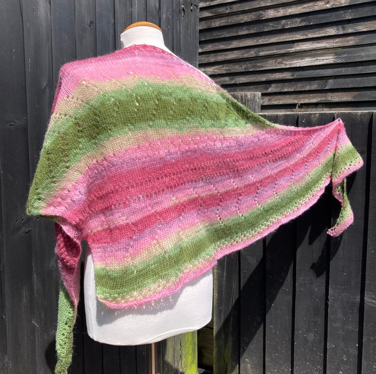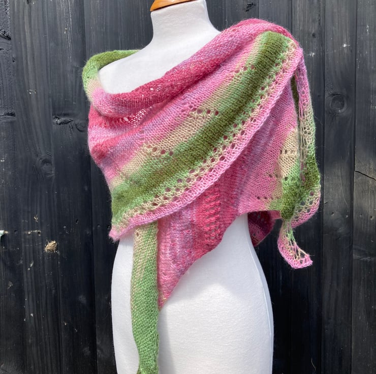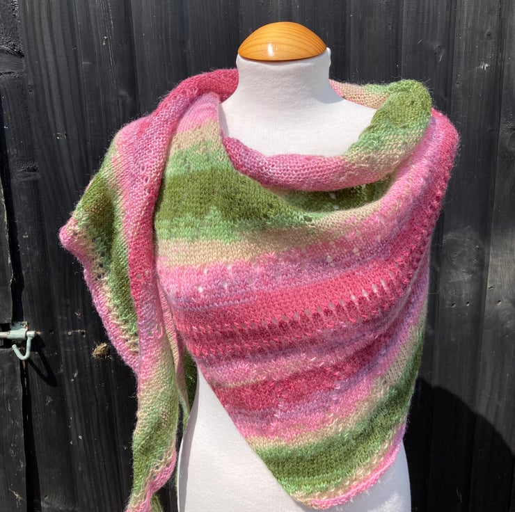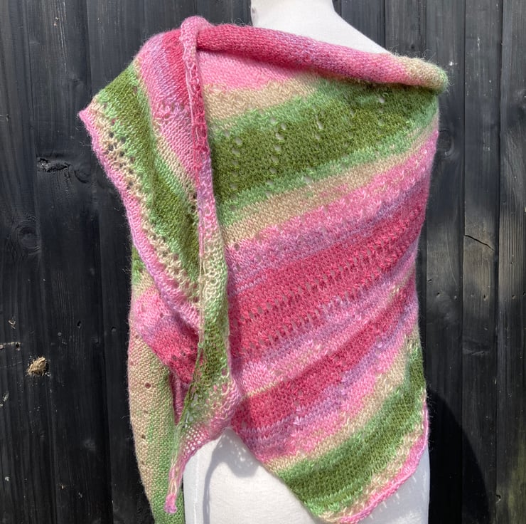Hand knitted asymmetrical shawl in soft mohair wool yarn