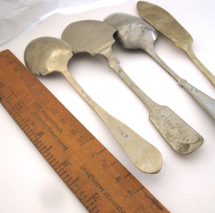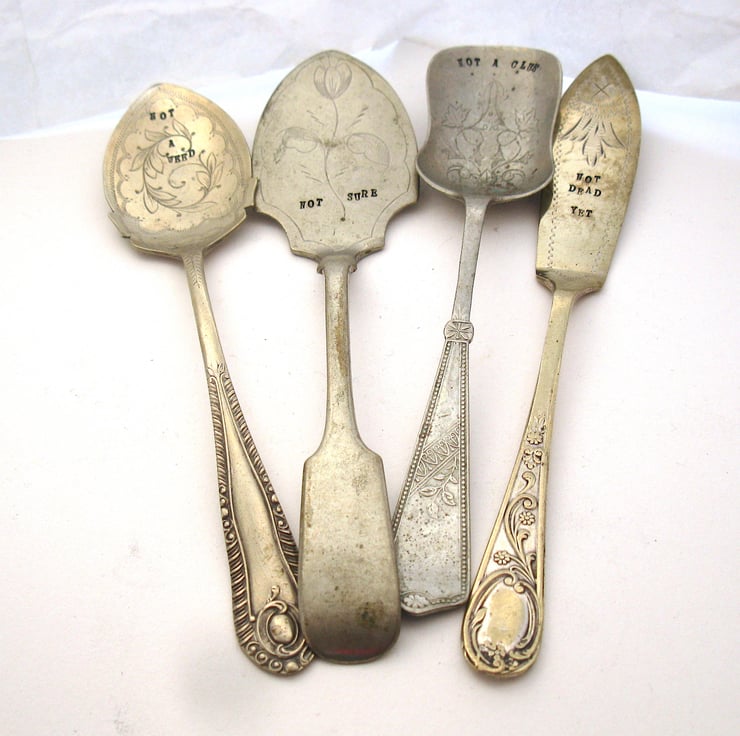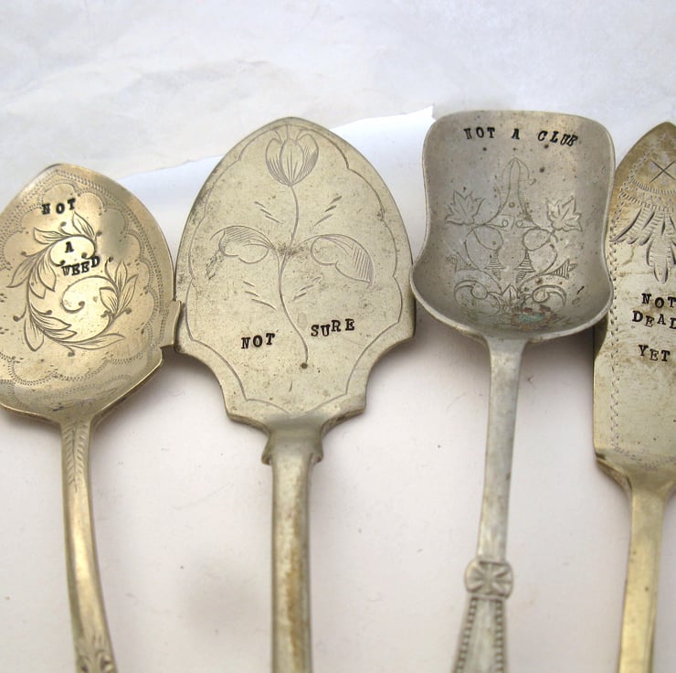 Four mismatched items of antique flatware - a jam spoon, a sugar scoop, a petit four server and a butter spreader - hand stamped and upcycled into plant markers that read NOT A WEED, NOT SURE, NOT A CLUE and NOT DEAD YET.