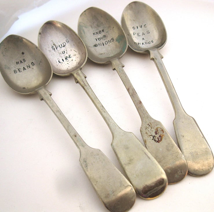 The perfect gift for a gardener with a sense of humour: some really bad vegetable puns! This set of four battered old dessertspoons has been handstamped for use as allotment vegetable labels. They say KNOW YOUR ONIONS, SPUDS U LIKE, HAS BEANS and the immortal GIVE PEAS A CHANCE.