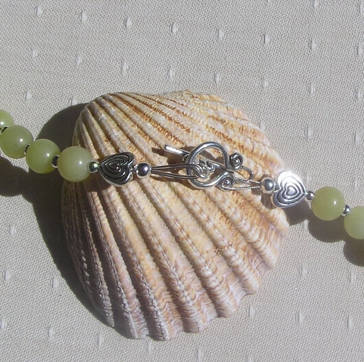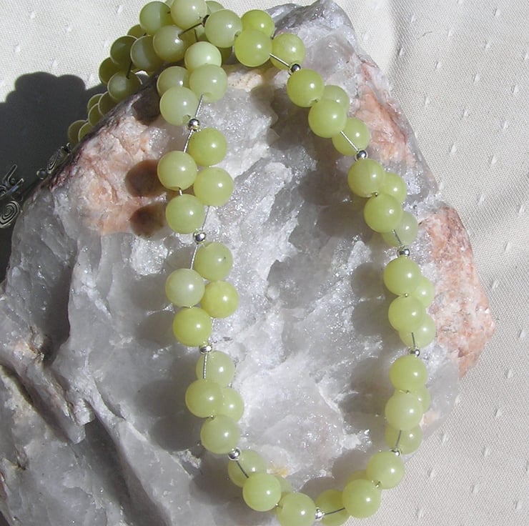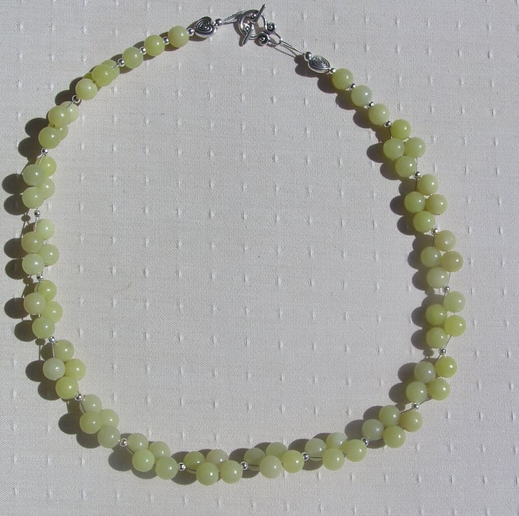 This Stunning Necklace is made wholly from Lemon Jade round beads clustered together in four's and for that added bit of sparkle tiny Silver spacer beads - a Gorgeous soothing effect that will look stunning either worn casually or with something more Elegant for a Special Evening out