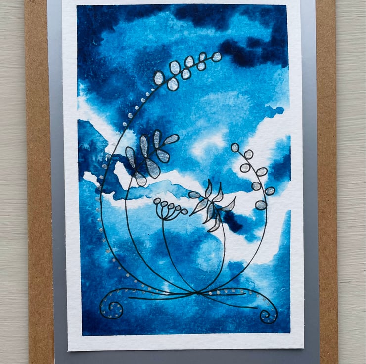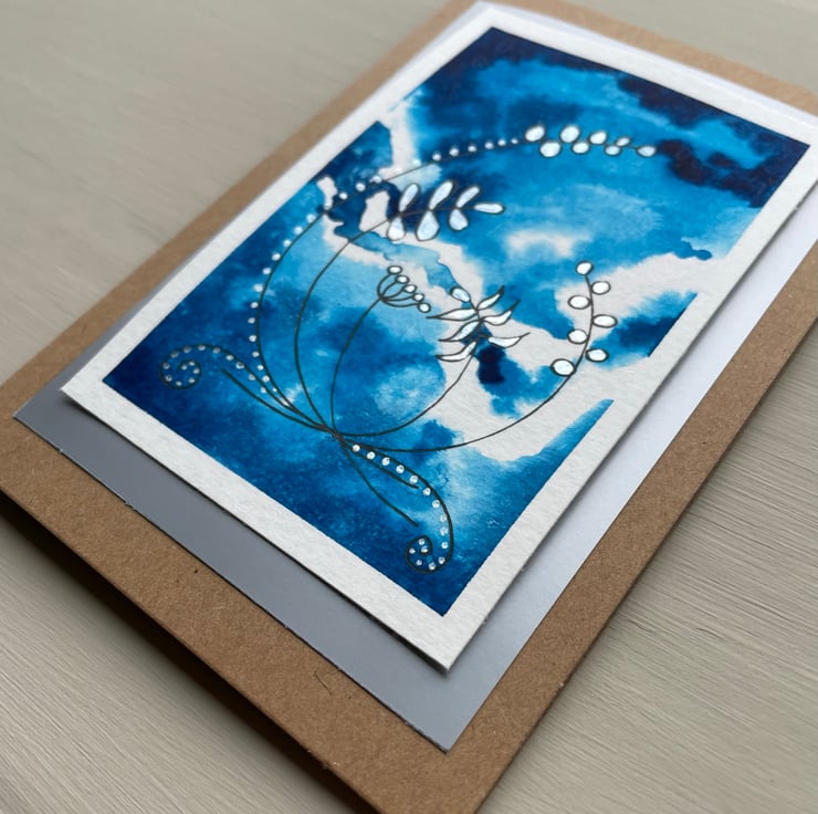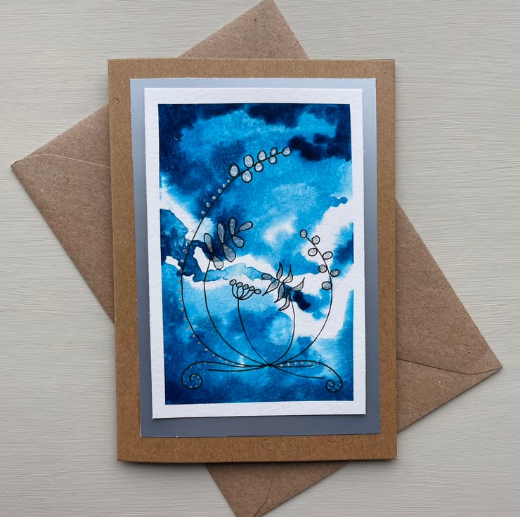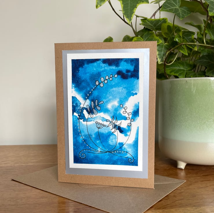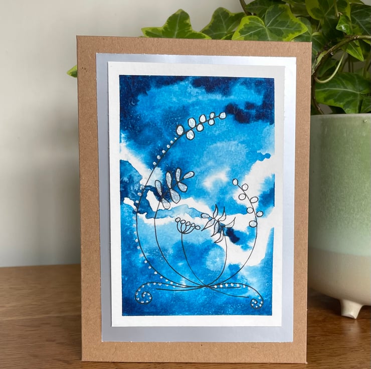 This blank greeting card features a swirling blue background colour overlaid with seedheads drawn in ink and painted in silver and mounted onto a matching silver card background border, it is left blank for any occasion from a birthday to a thank you note but could also be framed and put up on a wall.