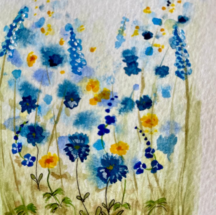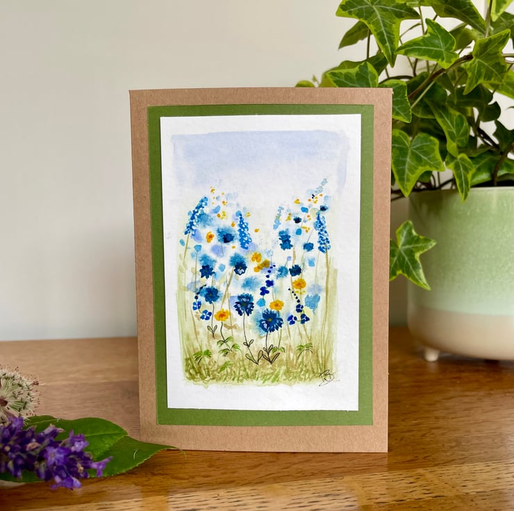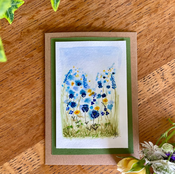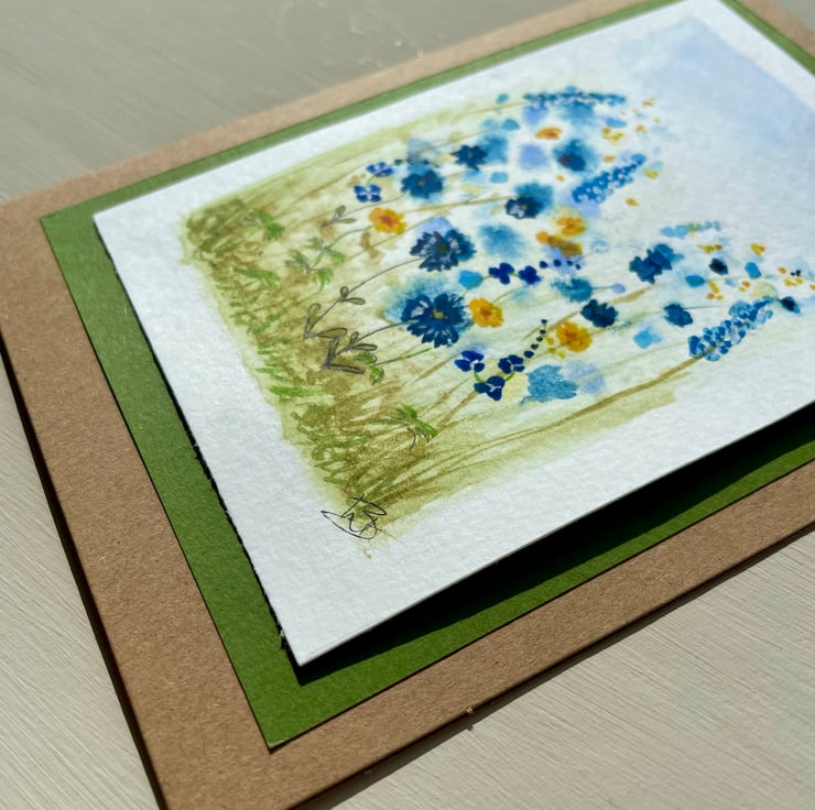 This blank greeting card features hand painted flowers in a mostly blue palette, with a few sunny yellows dotted between the blues, the painting is then mounted onto an olive green background card prior to mounting on a recycled brown craft card, it is left blank for any occasion from a birthday to a thank you note but could also be framed and put up on a wall.