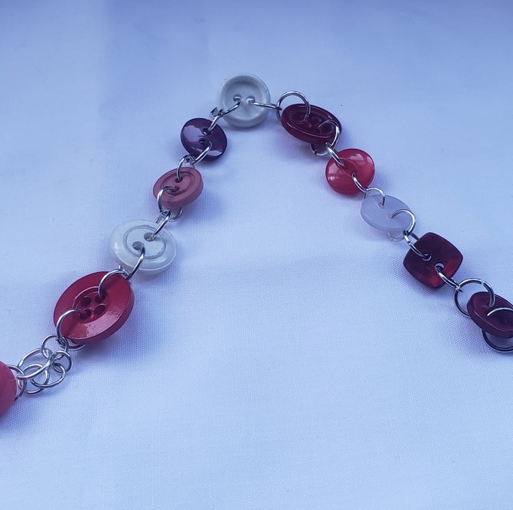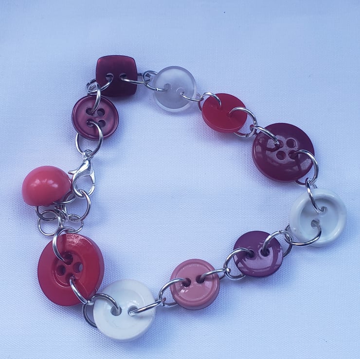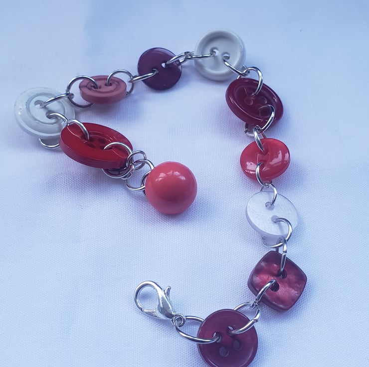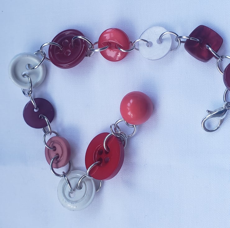 Using a variety of red buttons I've linked them together with jump rings and added a lobster clasp alongside a decorative hanging button. The buttons have been kept in a button box for many years so may not be perfect. Approx 18cm. Totally unique.