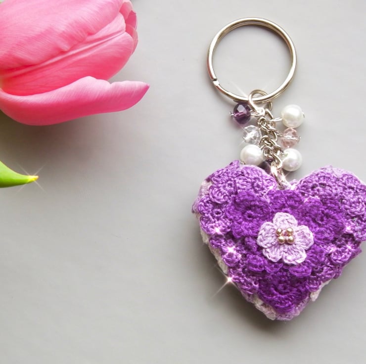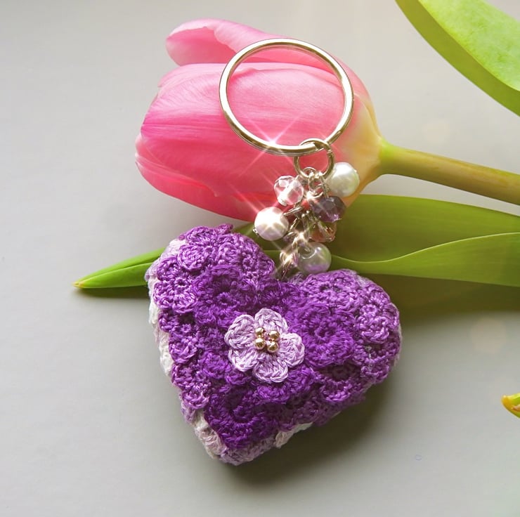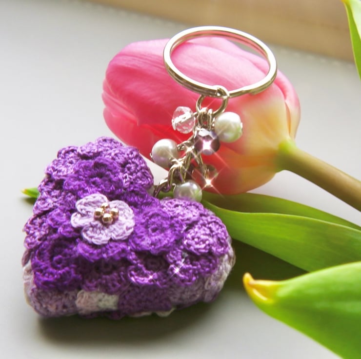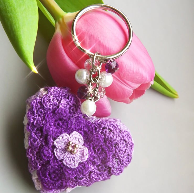 Keyring made with 6mm Purple and Clear Crystal glass beads, 6mm glass pearl and Embroidery thread.