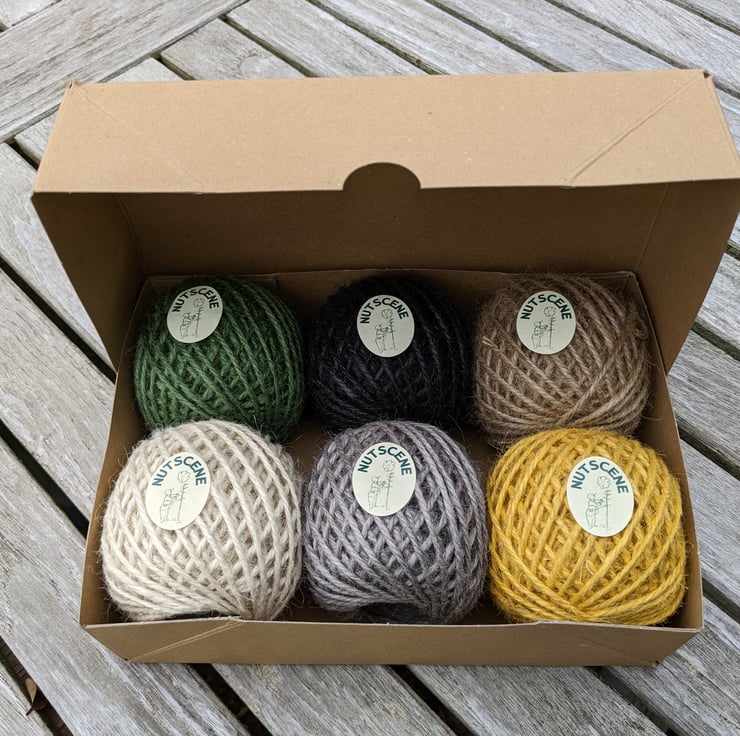 Lovely muted shades, including green, brown, saffron, white, black and natural. Presented in a cardboard box with a vintage label from the Nutscene archives.
