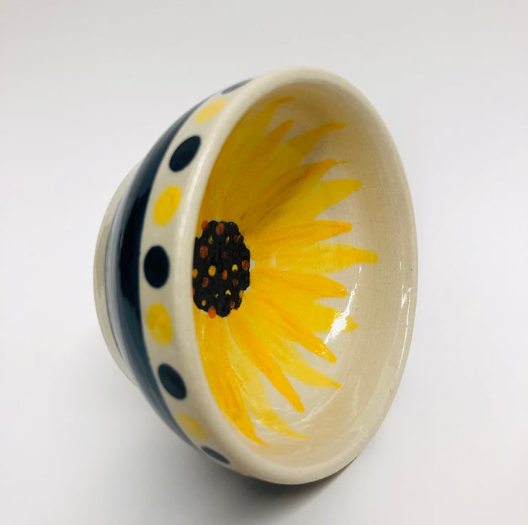 This thrown pottery bowl is made from white stoneware clay and I've used underglazes in bright yellow and deep blue to line it with a sunflower motif with a spotty border around the outside. Oven and dishwasher proof it is suitable to use as a functional bowl or as a little ornament to enjoy. It measures 9.5 cm in diameter and 4.5cm high. I think it would look lovely on a summer table with jam in it!