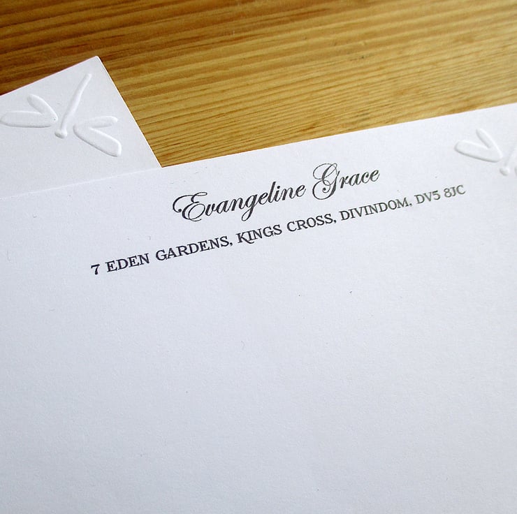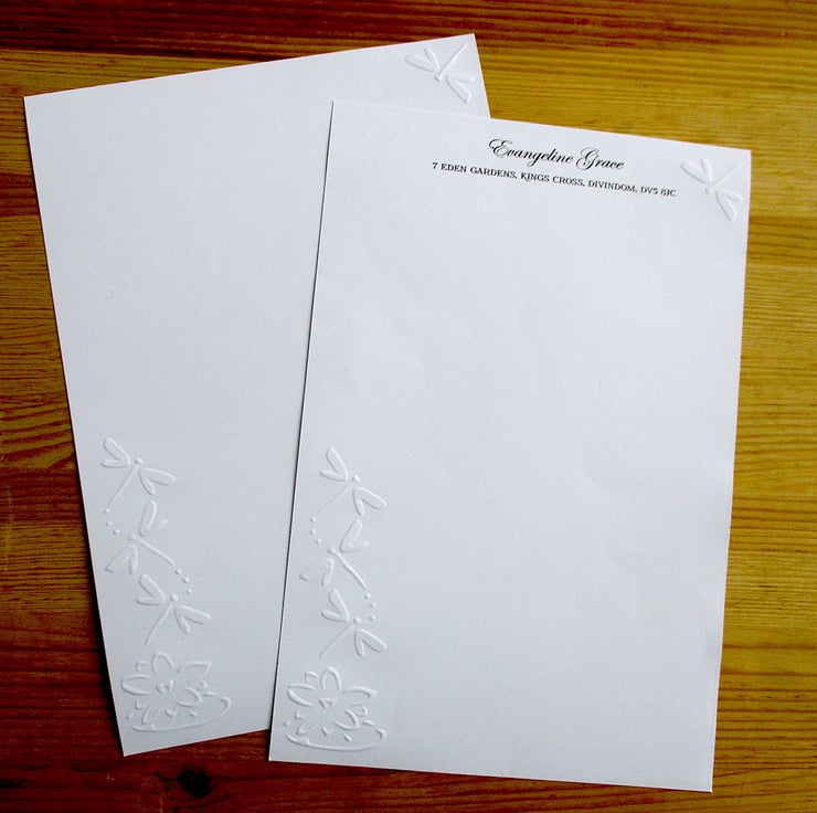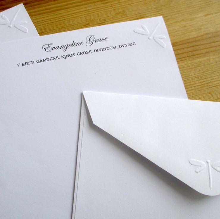 Elegant embossed Dragonfly writing paper set with optional personalisation.