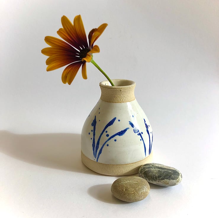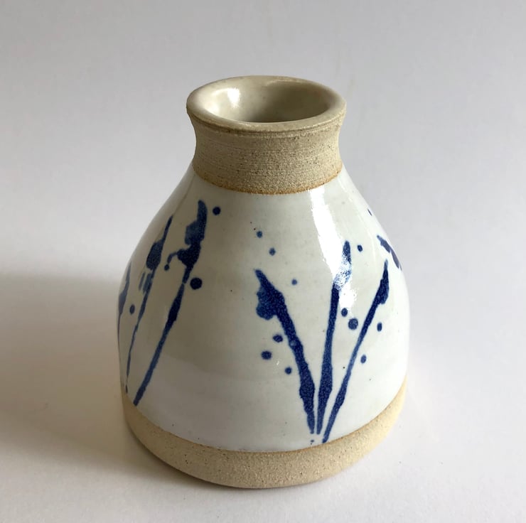 This thrown vase has been decorated with a shiny white glaze and then overglazed with an abstract design of grasses in a cobalt blue. Makes a charming little gift.
