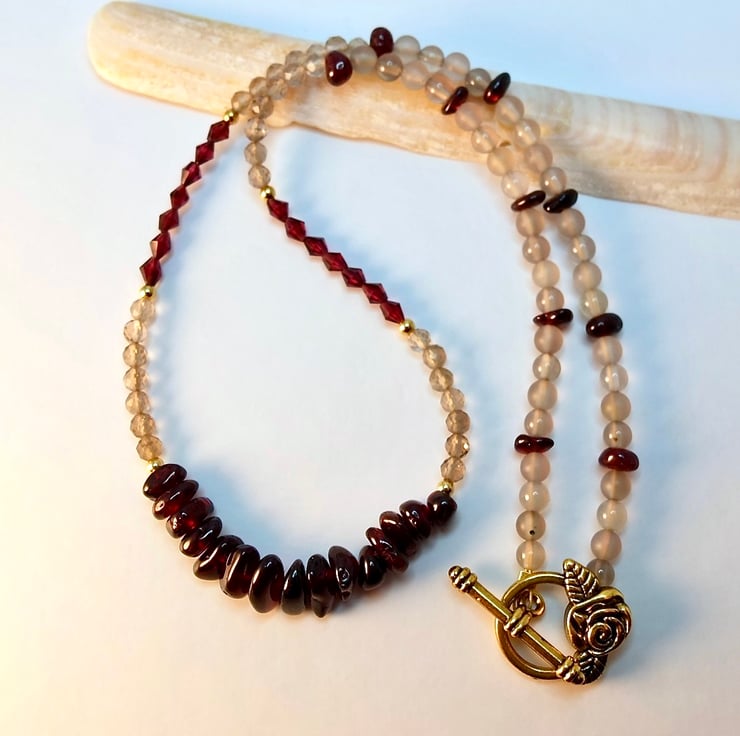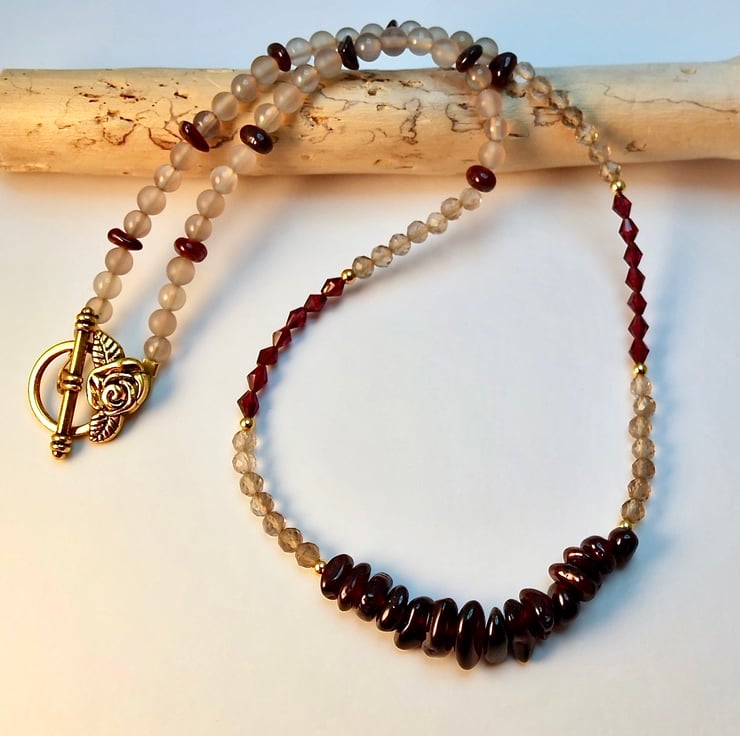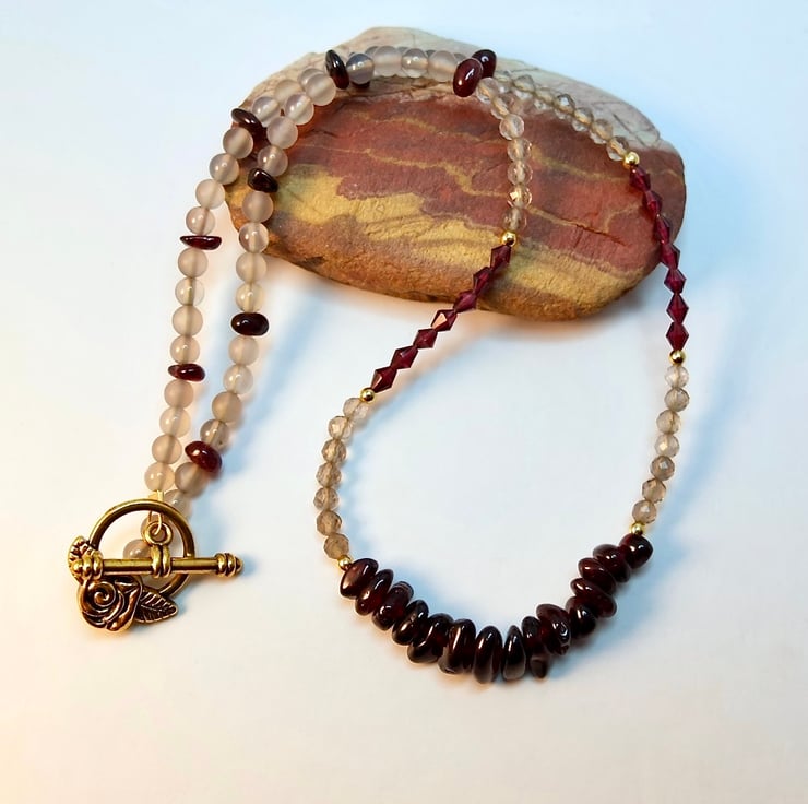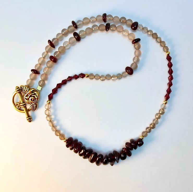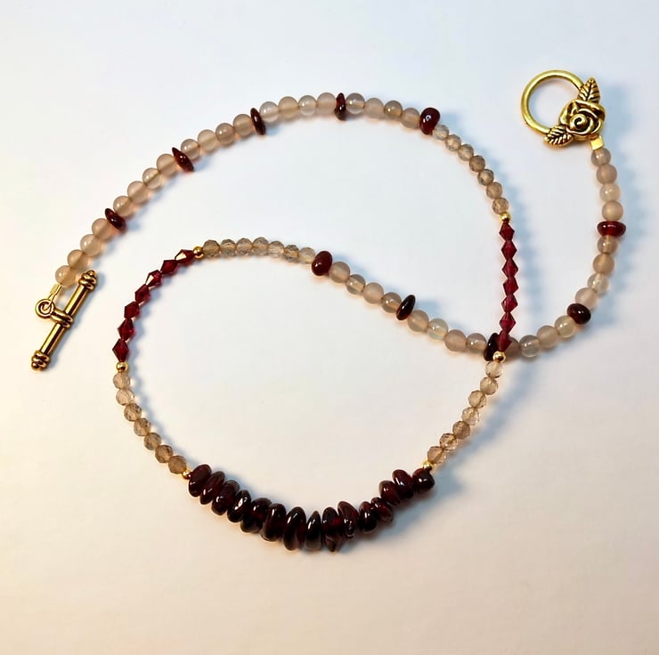 The necklace continues with a mix of polished and frosted 4mm light grey Agate rounds, accented with nuggets of Pyrope Garnet, and finishing with a rose Tibetan toggle clasp.