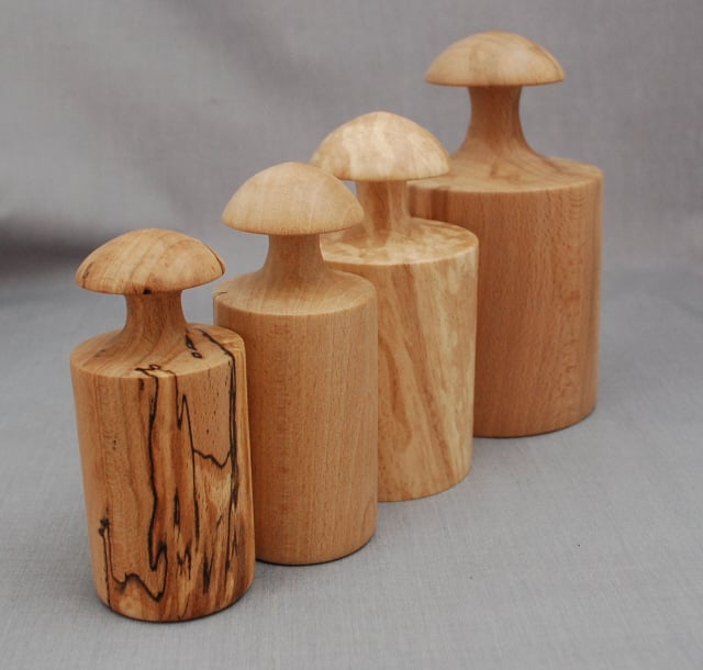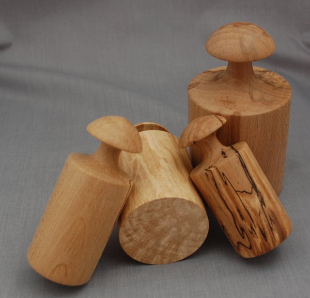 Randal has turned a set of 4 assorted sized raised pie moulds for all pastry cooks. Turned from spalted beech, making them suitable for both culinary use and as accessories for kitchen décor. They range in height from 10 cm high to 14.5 cm high, and a diameter of 4.5 cm to 8 cm wide approximately.