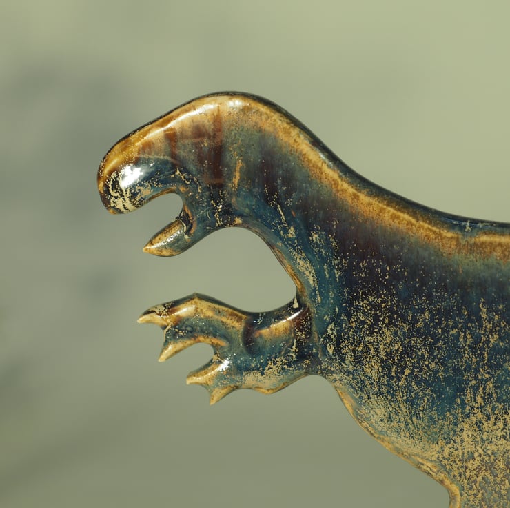 Each dinosaur is hand-drawn for individuality, cut out and shaped and mounted on a little plinth. When dry, they are then fired to 1020degC, then glazed and fired again to stoneware temperature at 1235degC.