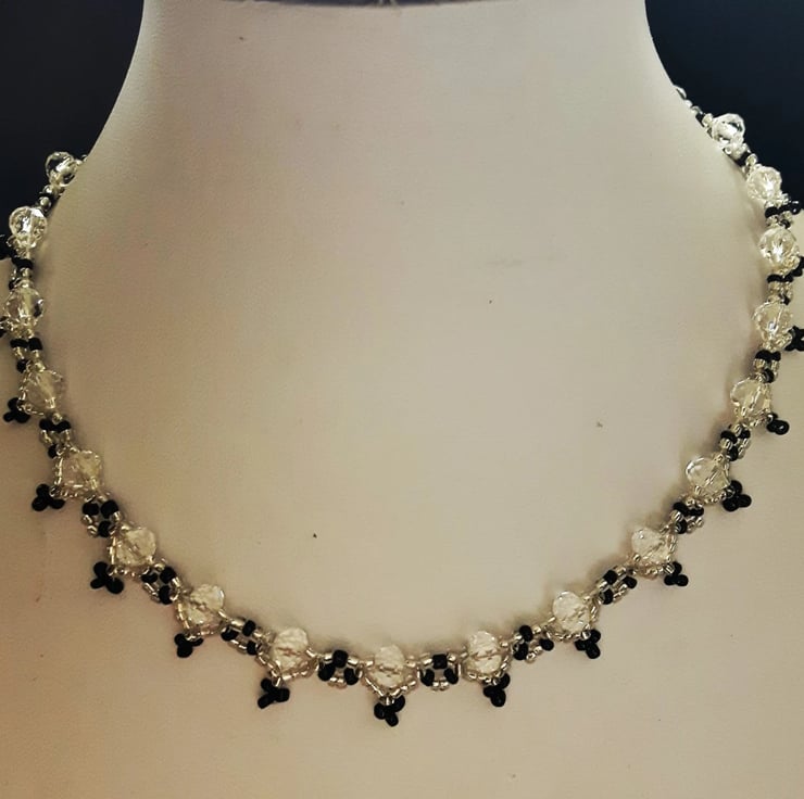 Crystal glass Bead NECKLACE art deco style SILVER BLACK glass 16" strand