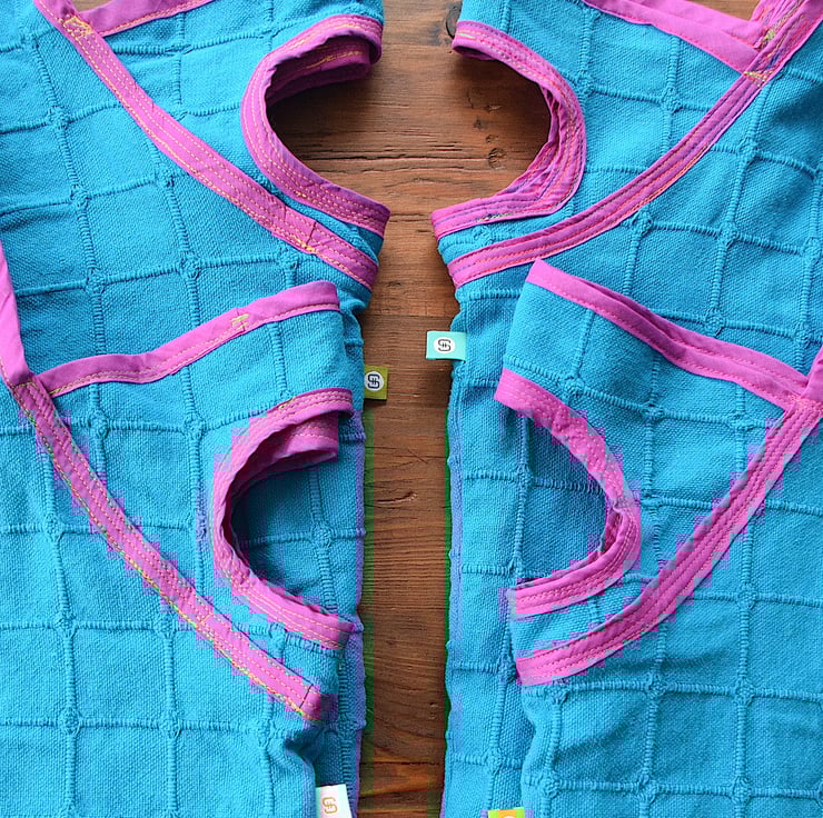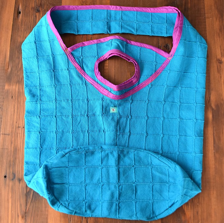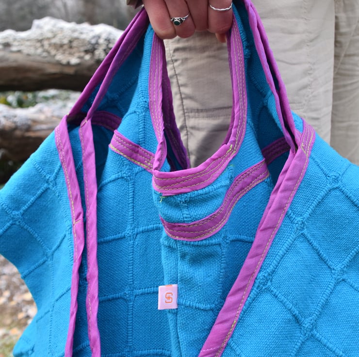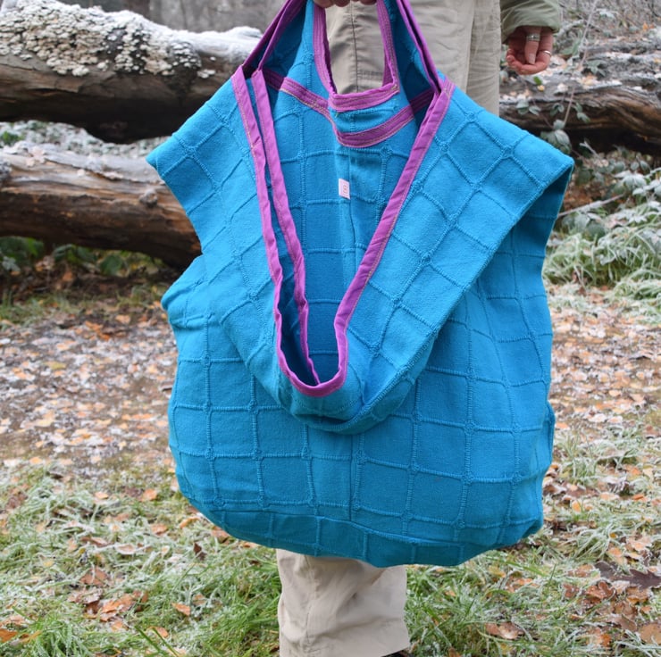 I found a lovely blue cotton throw in a thrift shop that seemed barely used which I repurposed to make these bags. The simple squares design caught my eye. I made the purple edge binding from cotton sari fabric and like the bold contrast it makes with the blue.