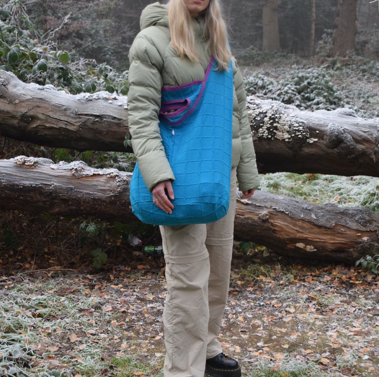 Shop sustainably – a thick cotton throw was repurposed for this project. It yielded enough fabric to make four pieces. I like each product I make to be as unique as the person who will use it, so no two bags are the same. For these, each is finished with stitching of a different colour, so you can choose your preferred colourway. Freestyle stitching on the carry handles sections give these bags a quirky and relaxed style.
