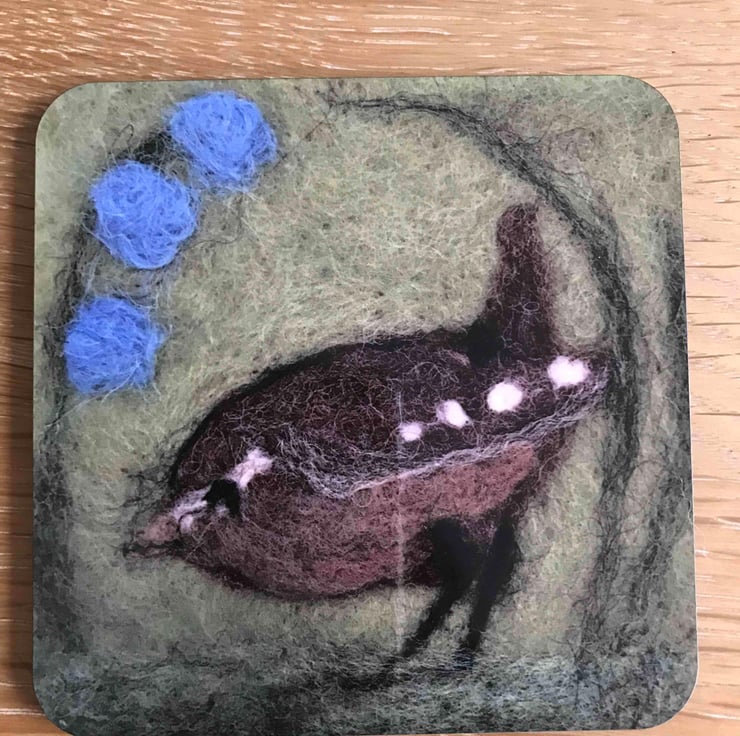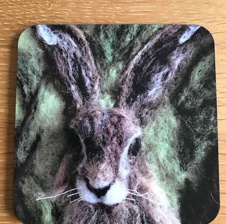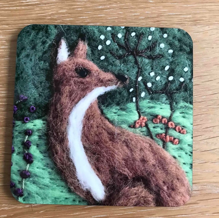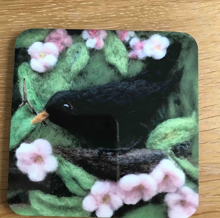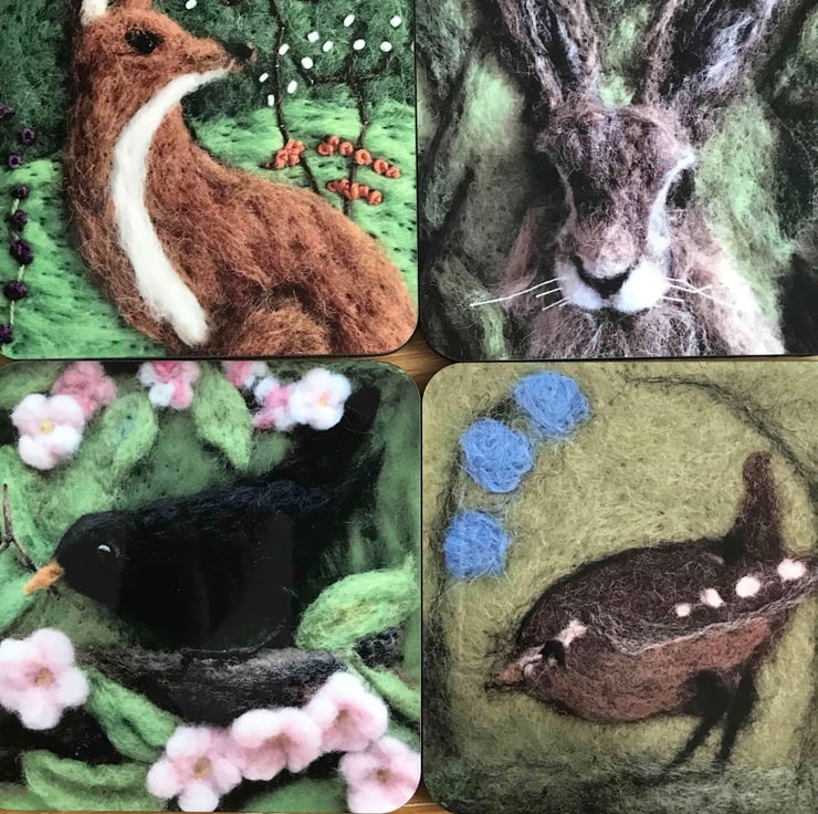Four coasters, printed from my original needle felted artwork. 4 inches square, with rounded corners. Gloss heat resistant finish , cork backed