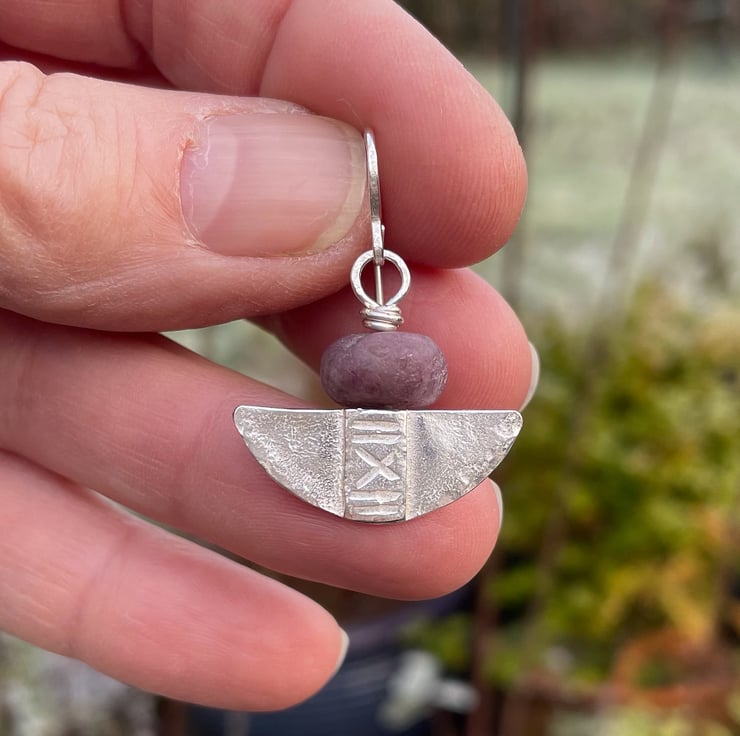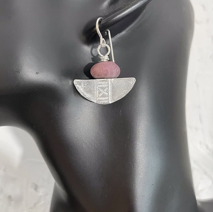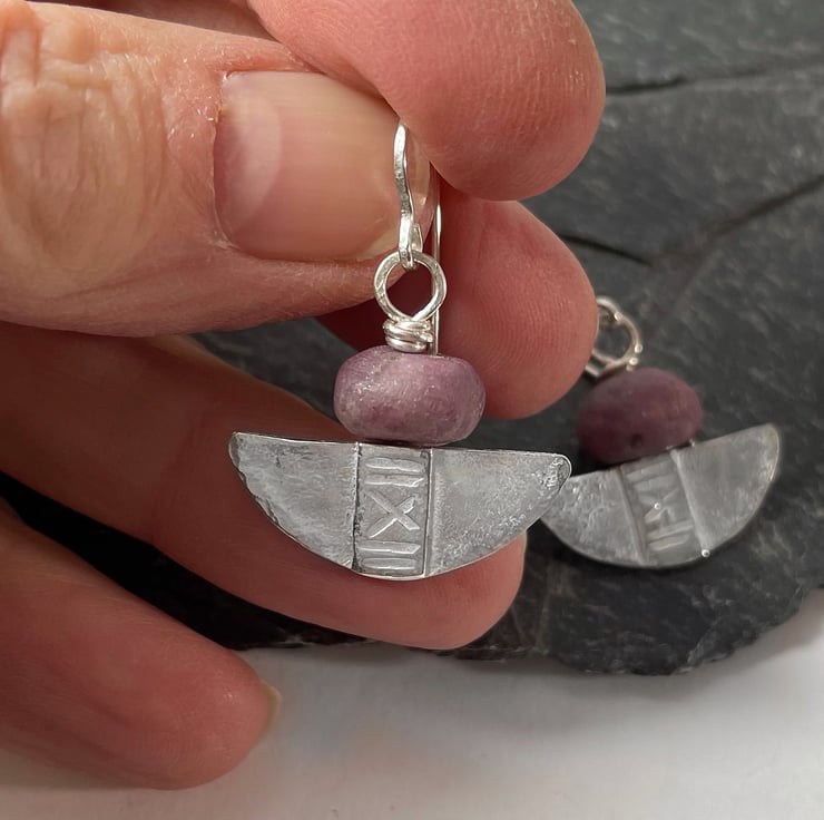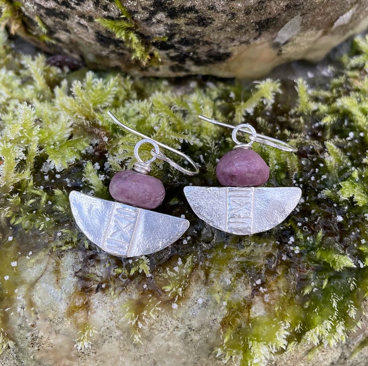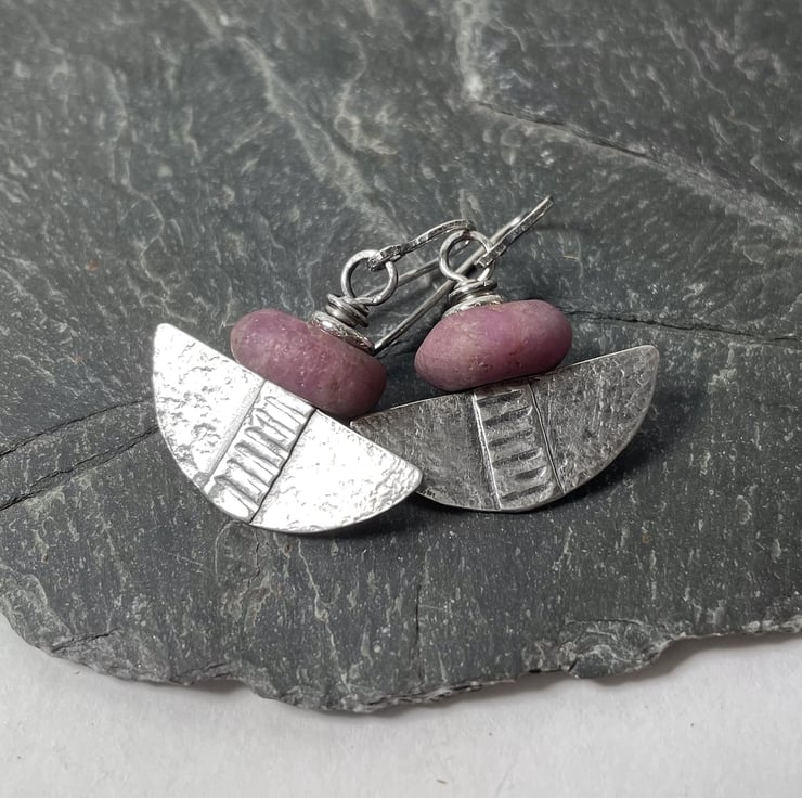 The silver blades have been fused and beaten for texture and a pattern has been punched. These are topped with lovely hand cut matte pink ruby rondelles.