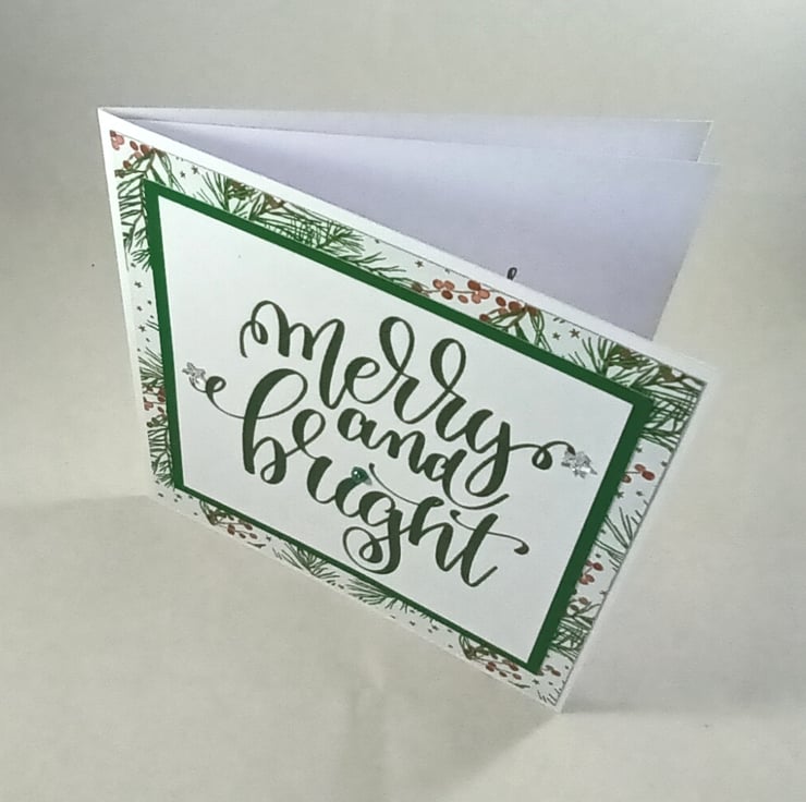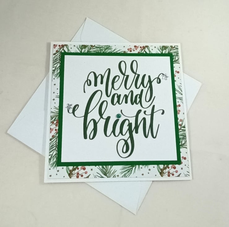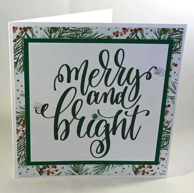 Square handmade Christmas card featuring the phrase 'Merry and Bright' printed in green ink using a swirly font. The text has been mounted onto dark green card, over a background of pine cones/needles and embellished with adhesive gems.