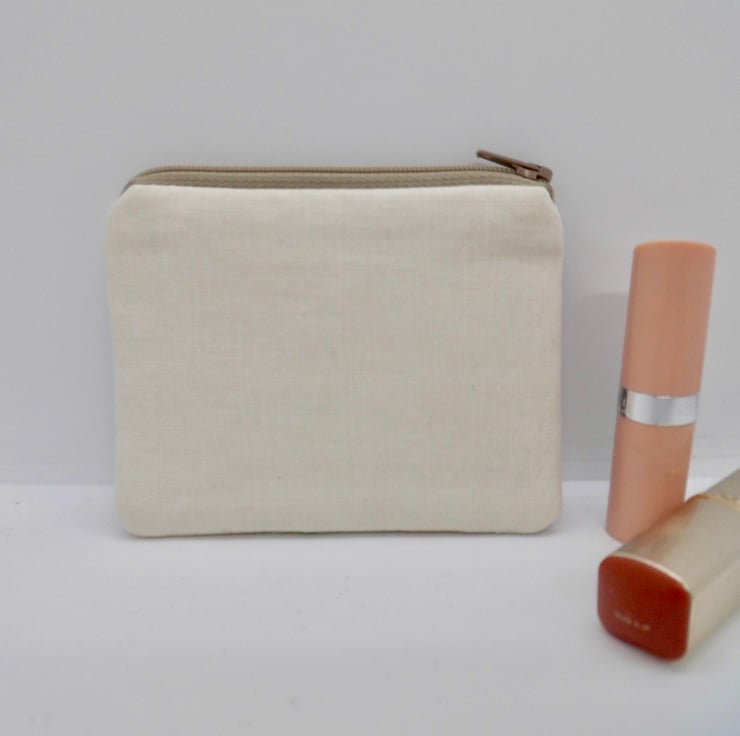 Flat style with beige zip across the top. It measures about 12cm x 9cm and could hold coins or cards or a couple of makeup essentials.