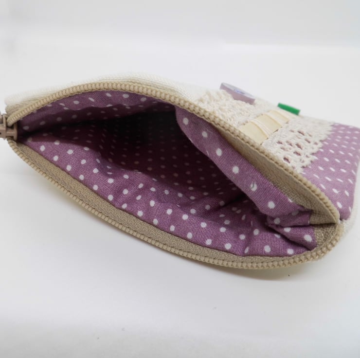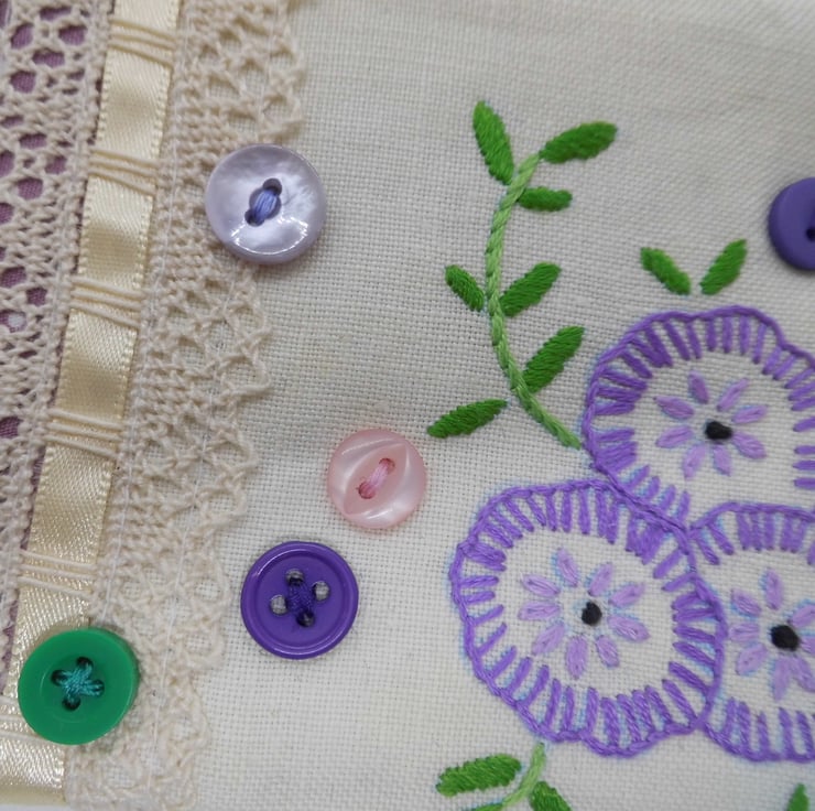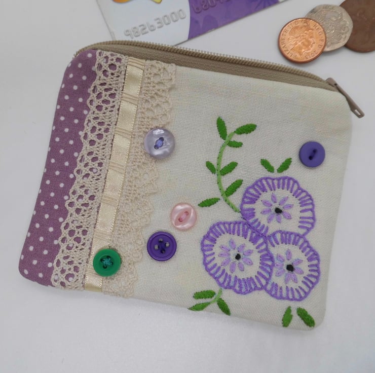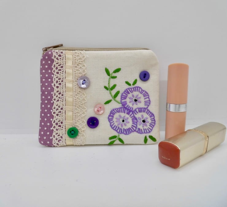 This dinky little coin purse is made using a piece of embroidered linen (or may be a cotton/linen blend), reclaimed from a vintage tray cloth. The embroidery features flowers in shades of mauve with green leaves. On the front I have also used a quilting cotton in a plum/white spotty print, a line of vintage lace and ribbon and a sprinkling of vintage buttons.
