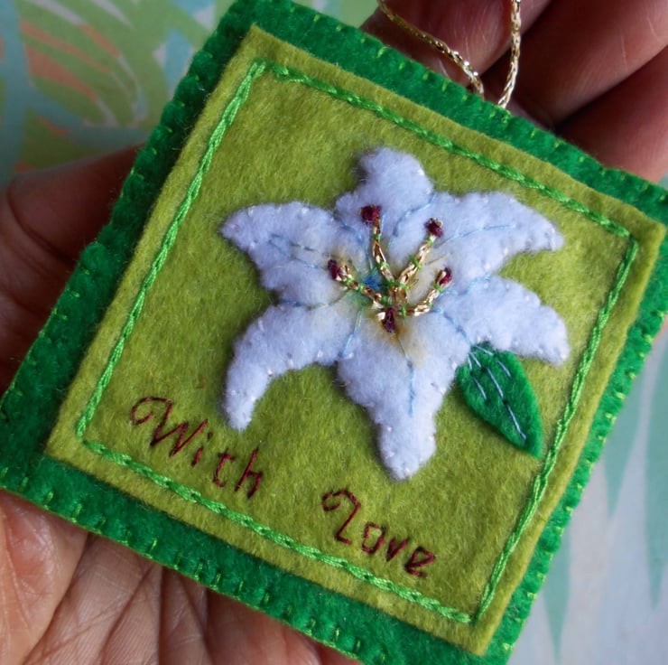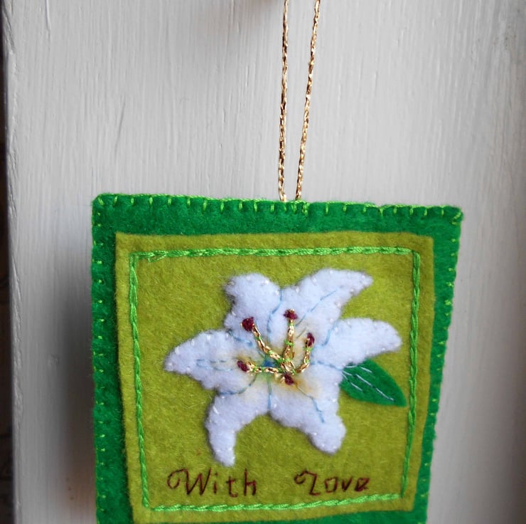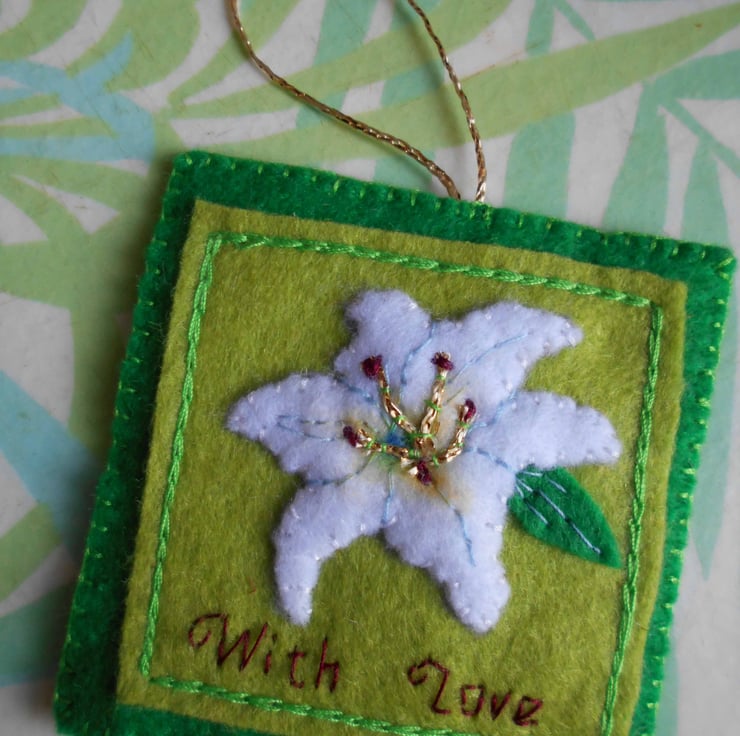 The decor is approx. 2.75ins wide (7.5cm) and 2.75 ins high (excl. loop). All wording is handembroidered by me. I do not use a sewing machine. The nature of handmade means that each decor will be unique and have slight variations. So each one will be an original.