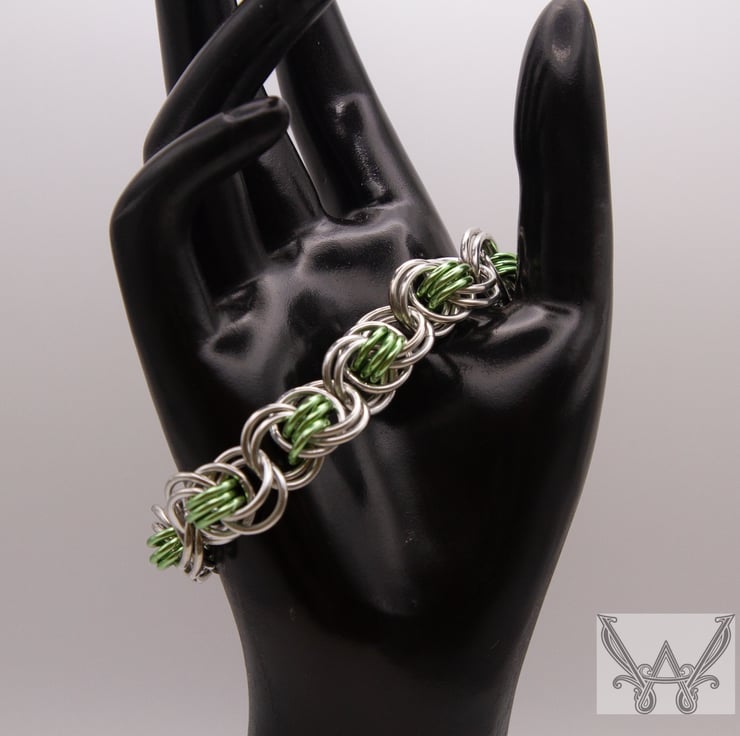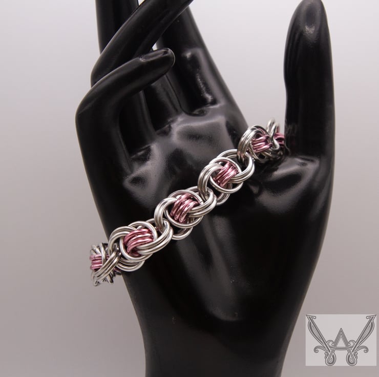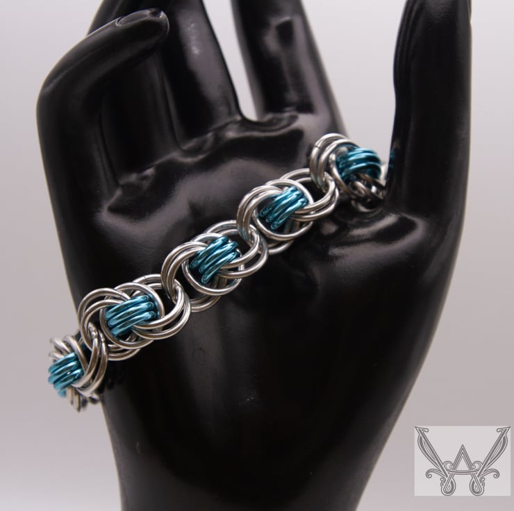 Handcrafted 'Ocean Waves' chainmaille bracelet made from anodised aluminium with a stainless steel clasp, these come in four colour variations; Blue, Pink, Green and Purple.