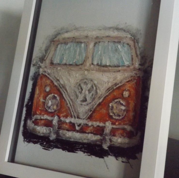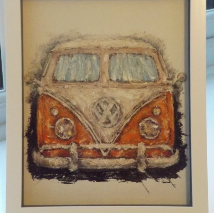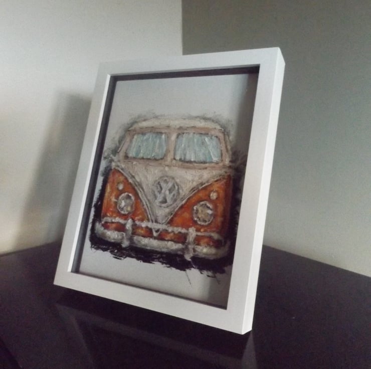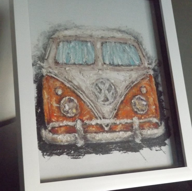 A hand painted picture of a VW campervan in oil pastel with acrylic paint pen backdrop. supplied with a white deep box frame. Picture measures 10" x 8" inches. Add another half an inch for the picture frame.