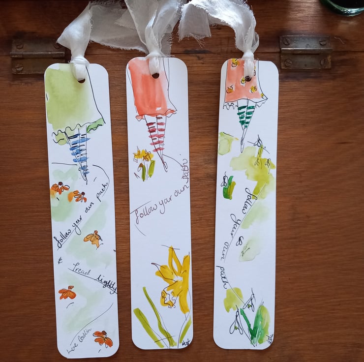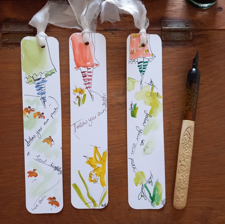 These are all individual. Hand drawn in Indian ink and coloured wirh watercolours. A dimple gift to pop in a card or write a message on the back. With silk trim at the top. I do personslised ones if you wish to have a name on them .