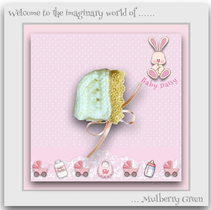 A sweet lemon bonnet trimmed with gold lace to fit baby Daisy. The bonnet is hand knitted and fastens with a gold ribbon tie.