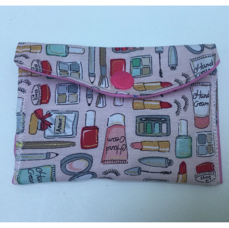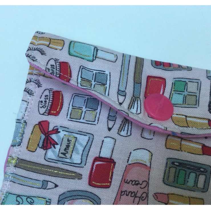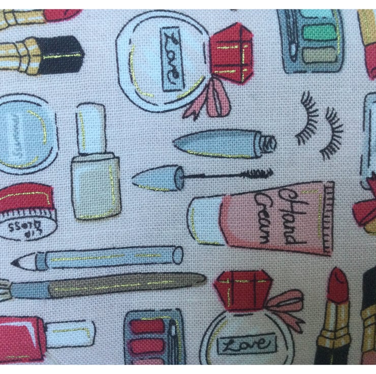 I love this make up fabric! It features lots of make up and cosmetic items such as lipstick and nail varnish etc. A great little purse/wallet for all your needs.