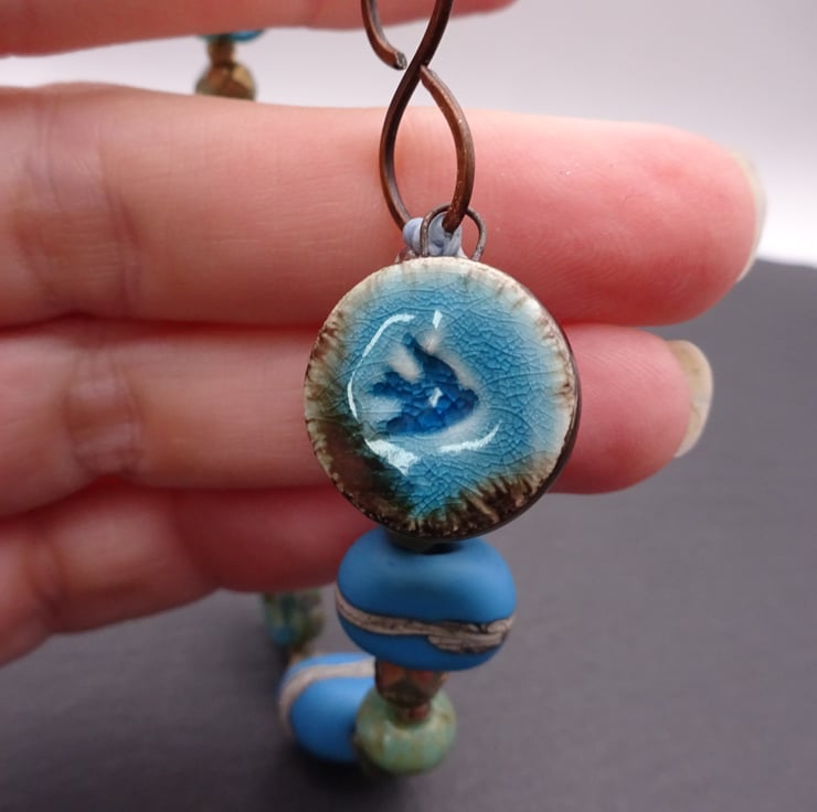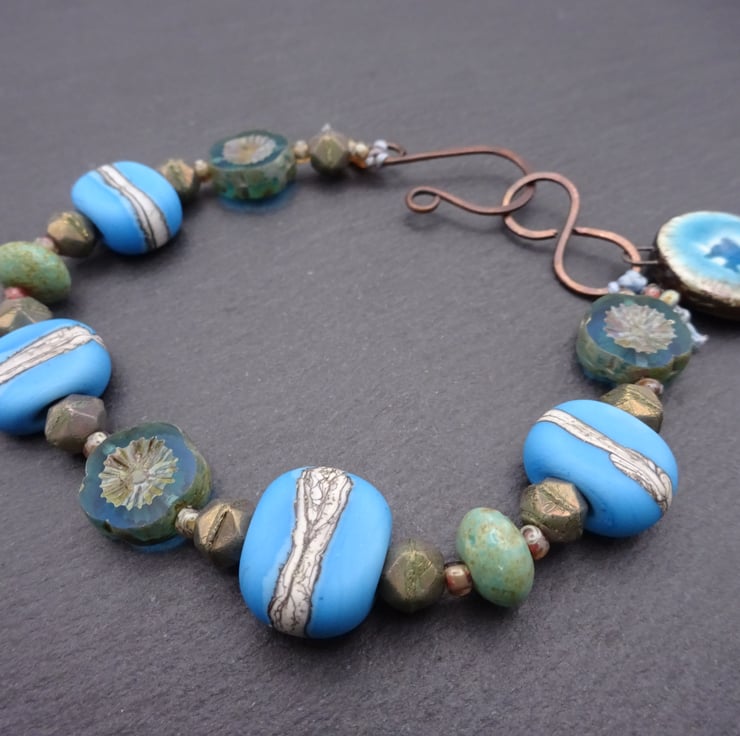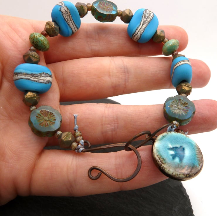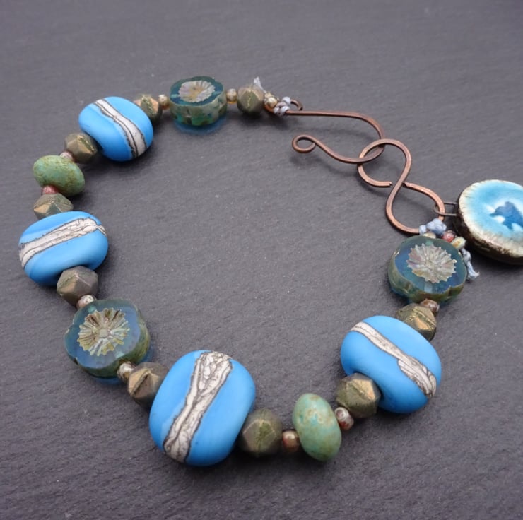 A bracelet made with handmade lampwork glass beads and Czech glass beads. It fastens with a handmade copper hook and features a handmade ceramic bird charm.