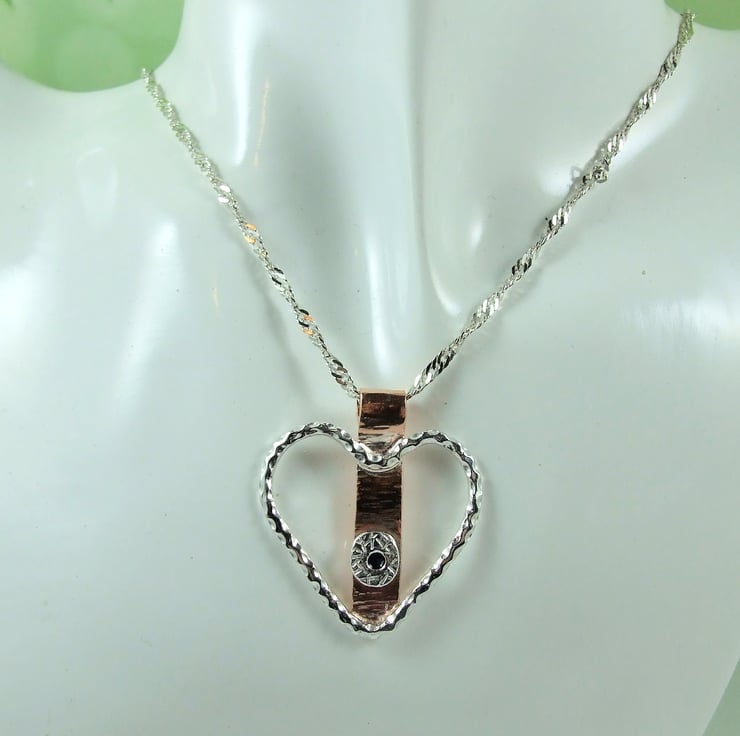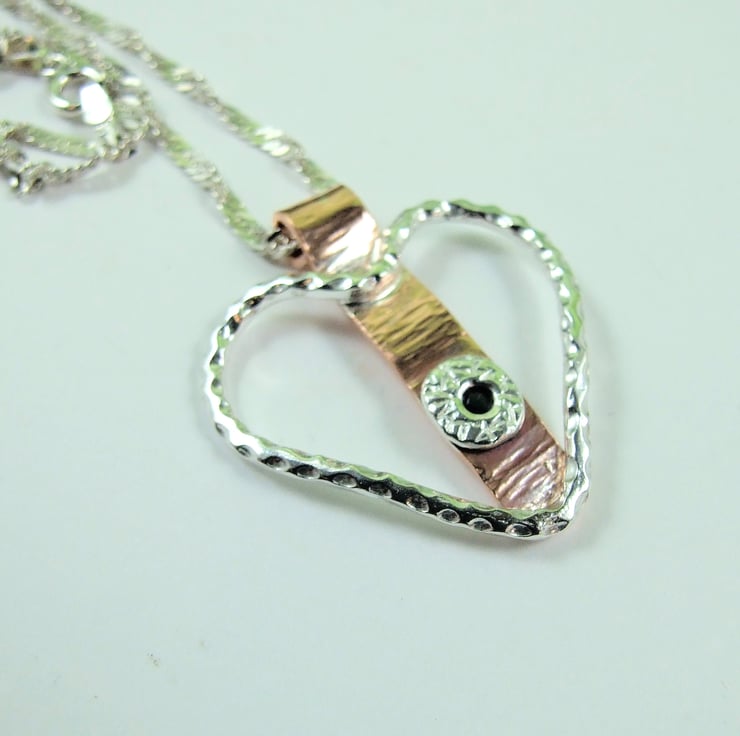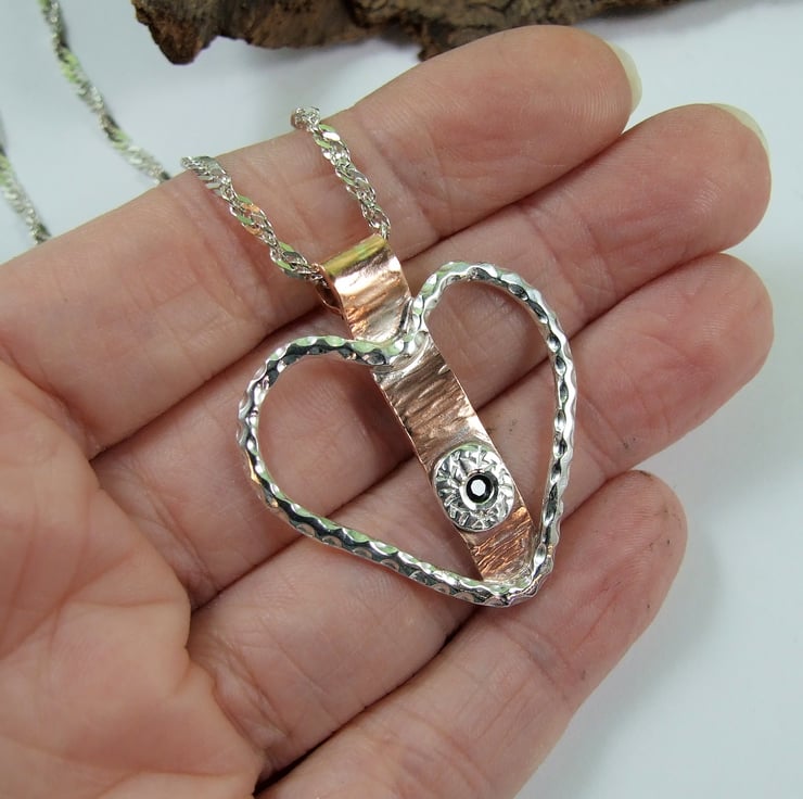 I created the heart from hand twisted sterling silver wire, this holds a textured copper bar on which I have added a silver disc textured with a hammer and set with a tiny 2mm faceted sapphire at the centre.