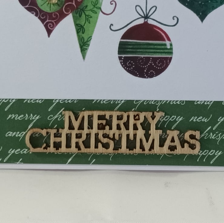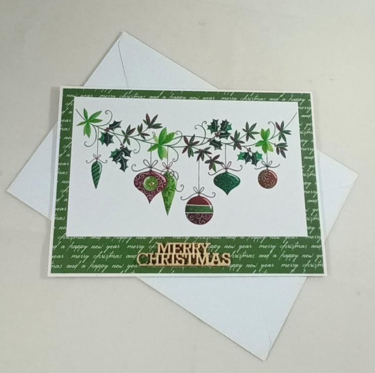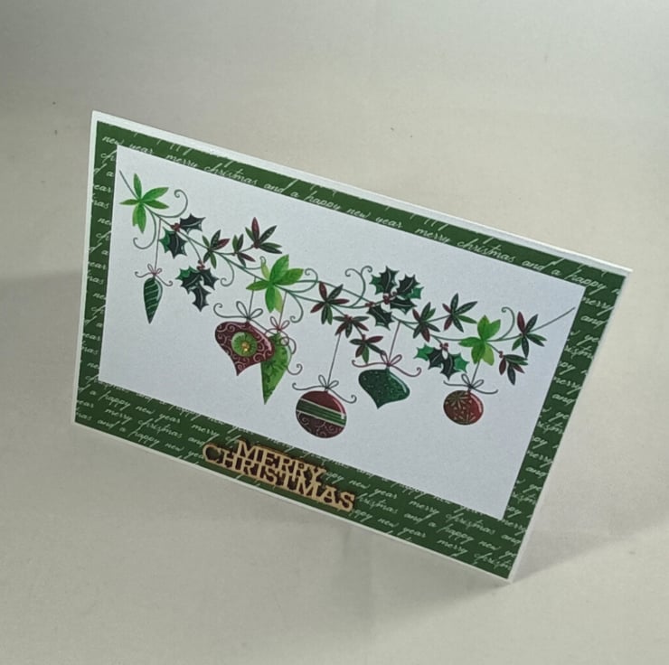A6 tent folded Christmas card featuring a garland of festive leaves and baubles. The image is overlaid onto patterned paper and has a wooden 'Merry Christmas' sentiment.. One of the baubles is embellished with a small gold coloured gem.