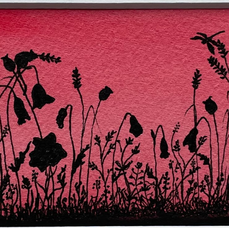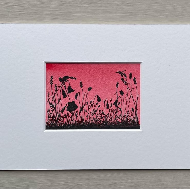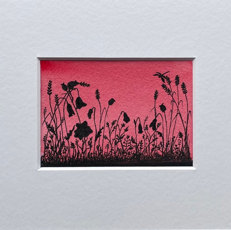 ACEO - Original watercolour painting, red background with carefully hand drawn ink pen silhouette of poppy flowers, seed heads, grasses and two tiny creatures, a mouse and a dragonfly.