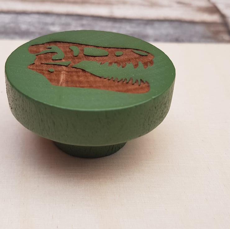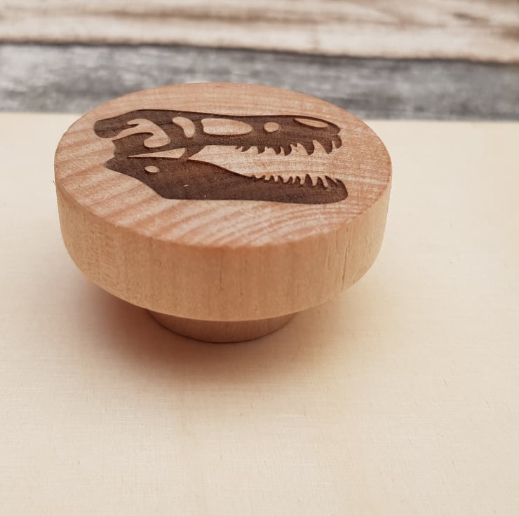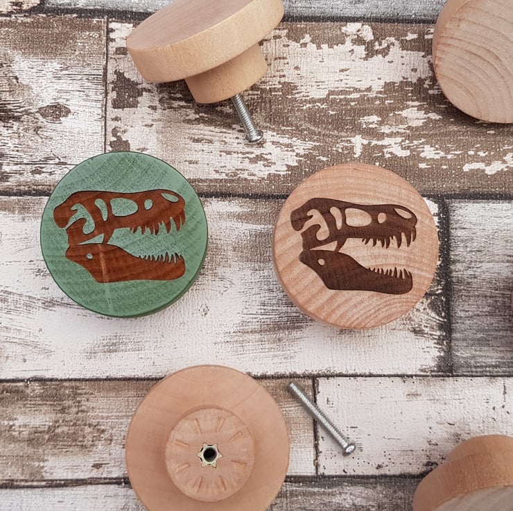 These engraved dinosaur skull skeletons can come plain wood or painted complete with screw bolt to mount they are the perfect addition to any dino mad prehistoric childs draws drawer t rex Jurassic park style we can also do other designs just ask before purchasing childrens room decor decoration