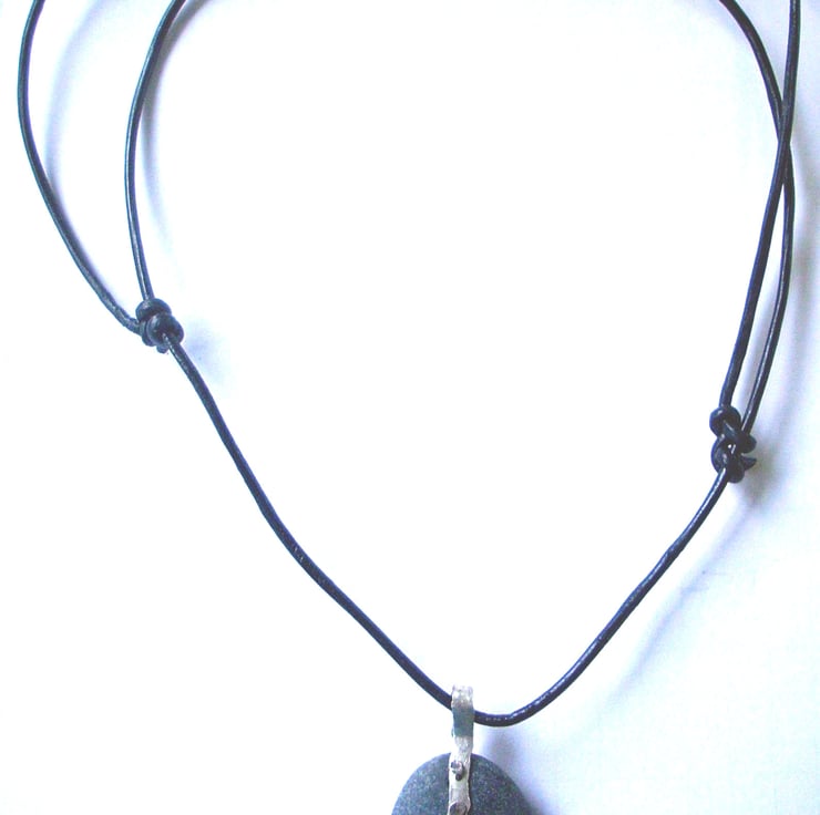 The pendant hangs from a narrow, black leather thong, the thong is fastened with two sliding knots so it can be adjusted to the length that suits you.