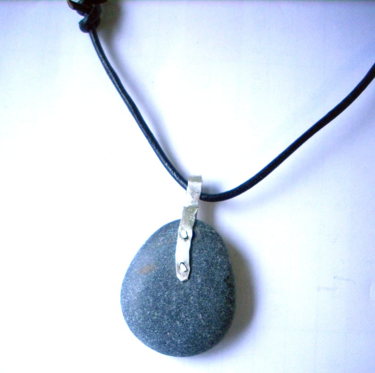 The pebble is lightly polished and drilled twice, I then hammered a piece of heavy silver wire to create the bail that suspends the pebble. Two short pieces of silver wire make the rivets, one end is melted into a blob and once they are put through the pebble and it's bail the other end is hammered flat, the blob is hammered flat too so it looks even.