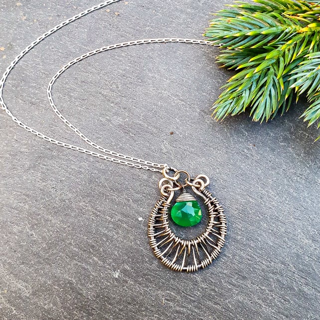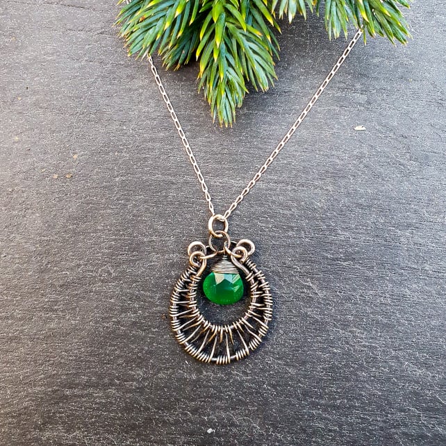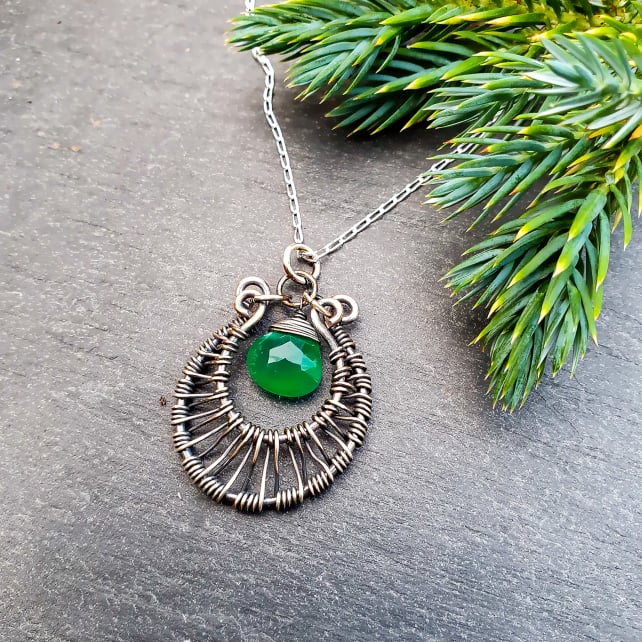 A beautiful green onyx and sterling silver wirework moon pendant.