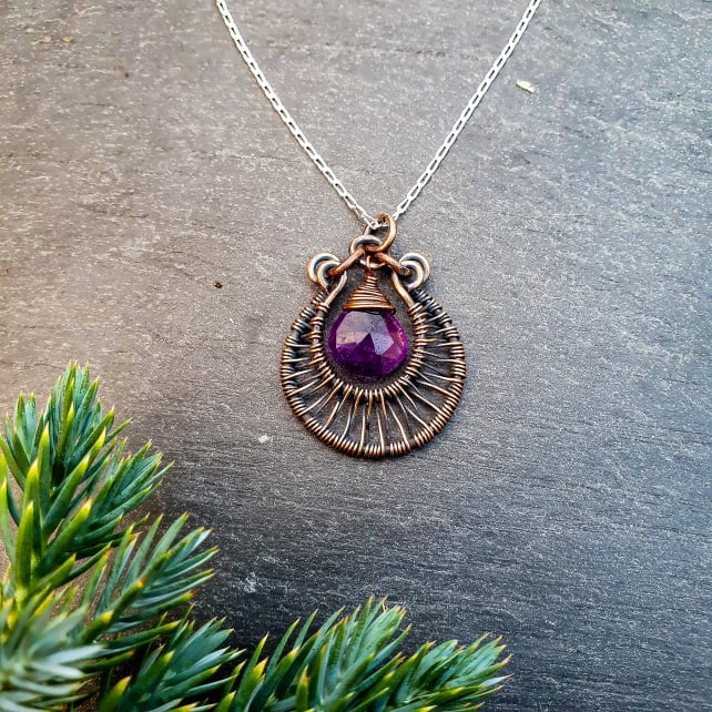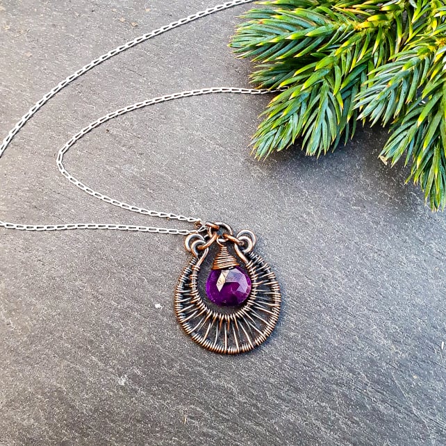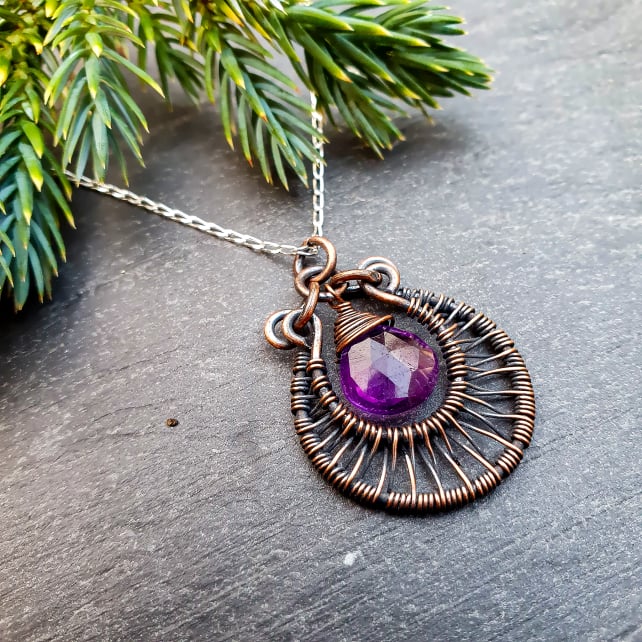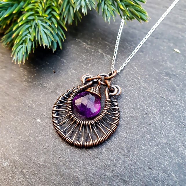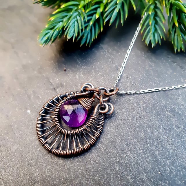 I have added a gorgeous faceted amethyst briolette which is wire wrapped with a thin copper wire, and the pendant hangs from an 18 inch sterling silver diamond cut curb chain.