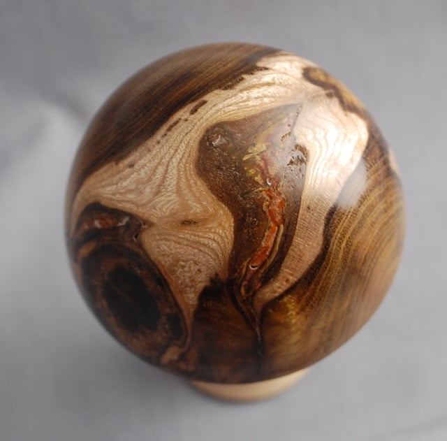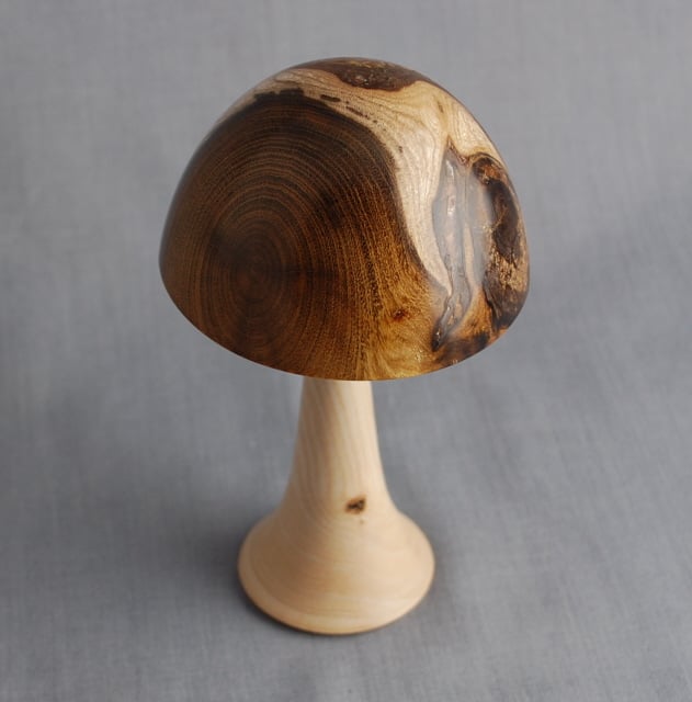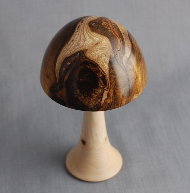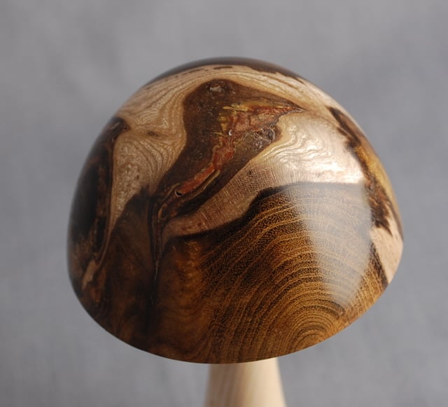 A striking section of laburnum timber has been transformed by Randal into the top of this toadstool. It stands proudly on stem of home-grown ash. As it measures approximately 14.5cm high and 8cm in diameter it will be an eyecatching addition to anyone’s collection of fungi.