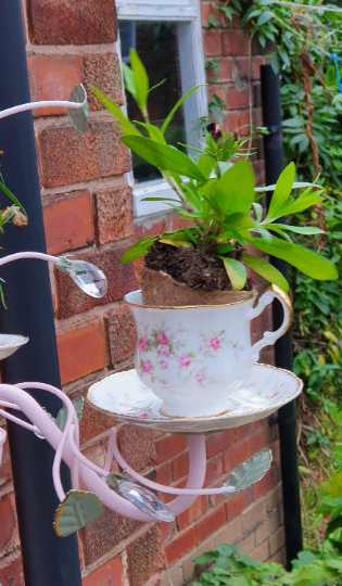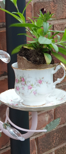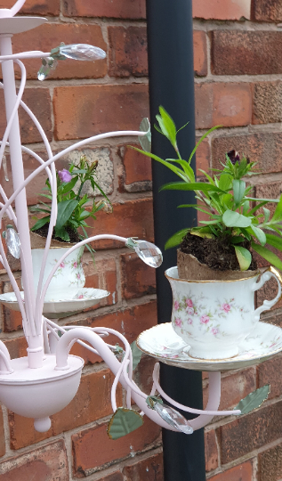 This lovely and unique chandelier has been upcycled and hand-painted in baby pink, green and gold. Gorgeous china teacups and saucers have been added. It can be used indoors or outdoors and can be used to display hanging plants. trailing summer flowers, candles, solar lights or tea lights. You could display the chandelier from a bracket as I have done here to replace a regular hanging basket or from a pergola or in a seating area. Using citronella tealights or little candles in it would be an effective way of keeping pesky insects away.
