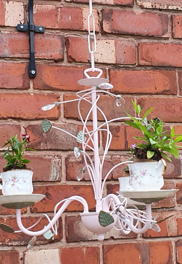 Each chandelier I design and make is unique. I upcycle unwanted or broken chandeliers and add mugs, teacups or pots. This lovely planter would make a beautiful addition to any home or garden. The teacups and saucers and glued together and secured to the chandelier with screws so they really are extremely secure and designed to withstand the British weather. The paint used is outdoor and then sealed with a matt varnish.