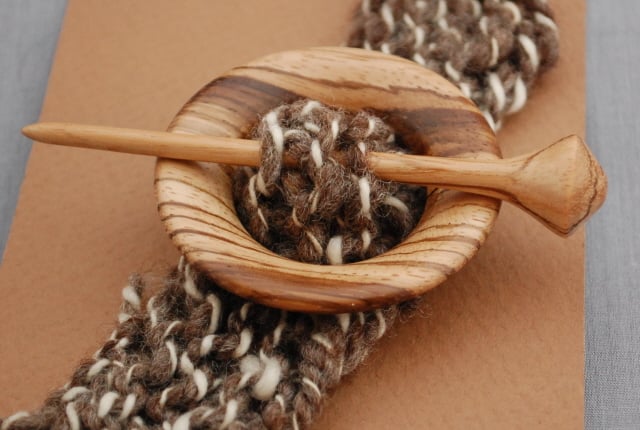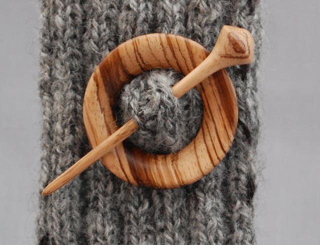 Disc and pin fasteners have been used since the early 10th century. Randal has turned this zebrano wood to create the disc and a pin to match. The shawl pin measures approximately 5.5cm in diameter with a pin 10 cm. Shawl pins add interest while holding draped fabric in place.