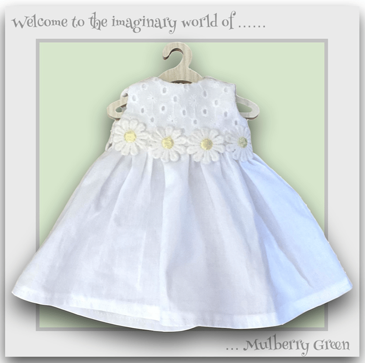 A sweet little white dress with a broderie anglais bodice and decorated with daisies, to fit the Mulberry Green characters. The dress is made from cotton and has a full skirt and a lined bodice.