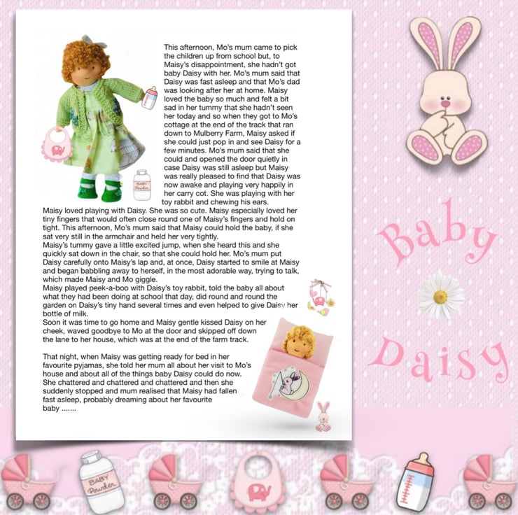 There are other children in Maisy’s class at school - Violet, Billy with his pet rabbit, Amber, Tilly, Rosie and her kittens, Amelia, Ruby, Marigold, Bobby with Max the dog, and the twins Oliver and Olivia, who have a puppy called Oscar. The dolls are all 26cm tall and baby Daisy is 16cm. Maisy and Mo love nothing more than having adventures with their friends. You can read about their adventures on my Facebook and Instagram pages - Maisy Muffin Rag Dolls and on my Mulberry Green Pinterest boards.
