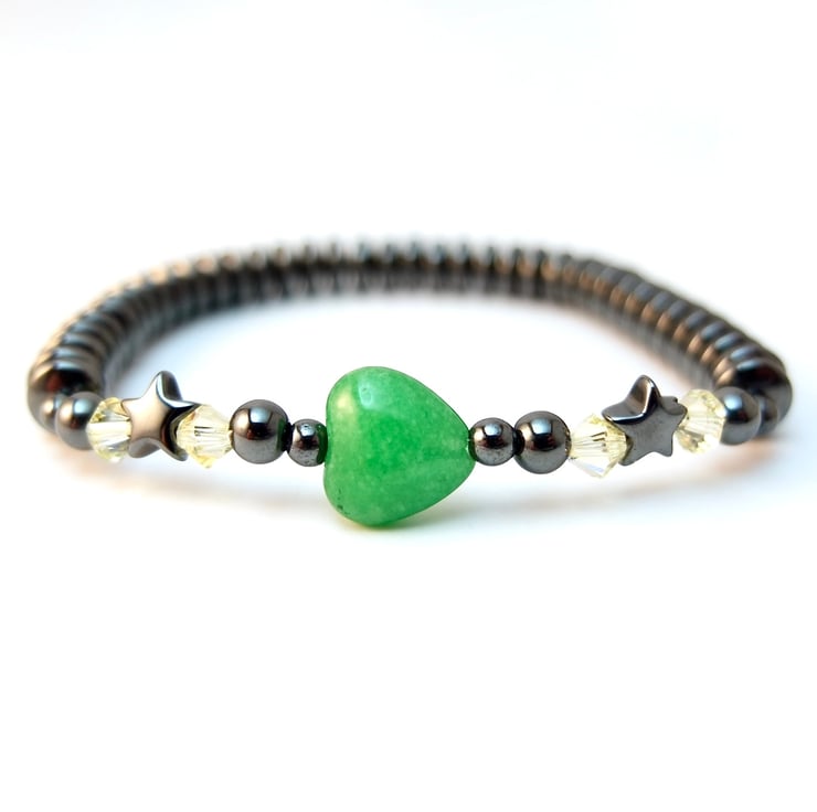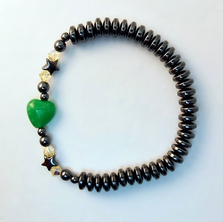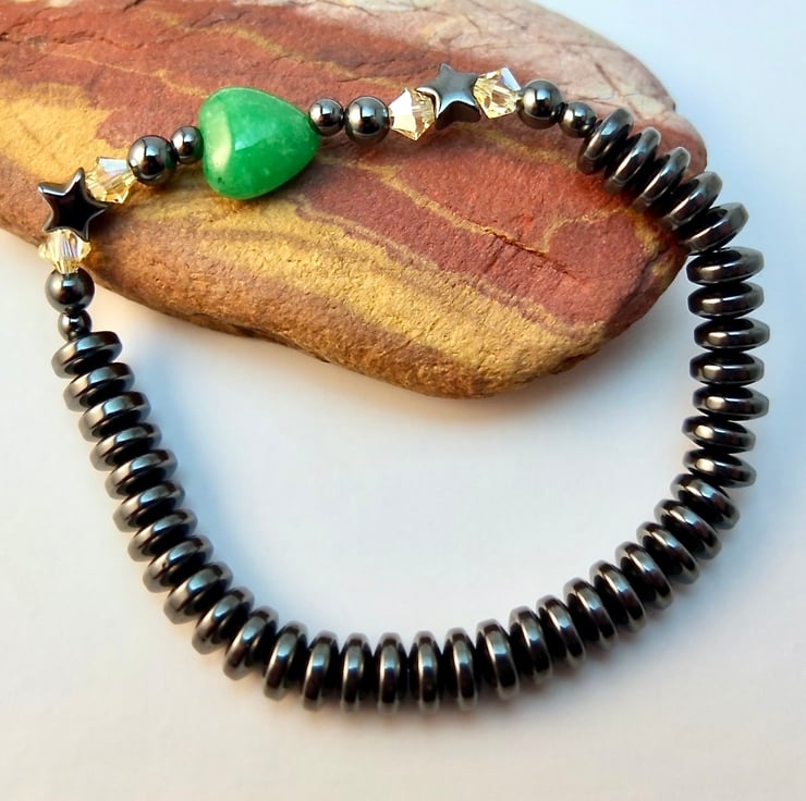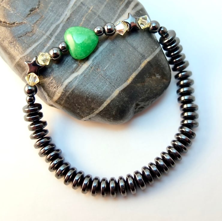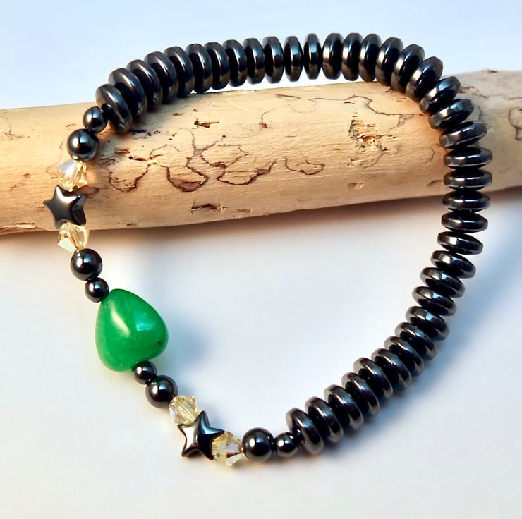 This striking bracelet features a 10mm green Jade heart set between a 6mm Hematite puffed star, a pair of sparkly 4mm 'jonquil' Swarovski bicones and 4 and 3mm Hematite round beads.