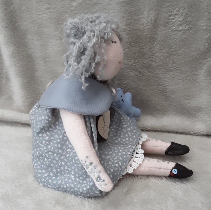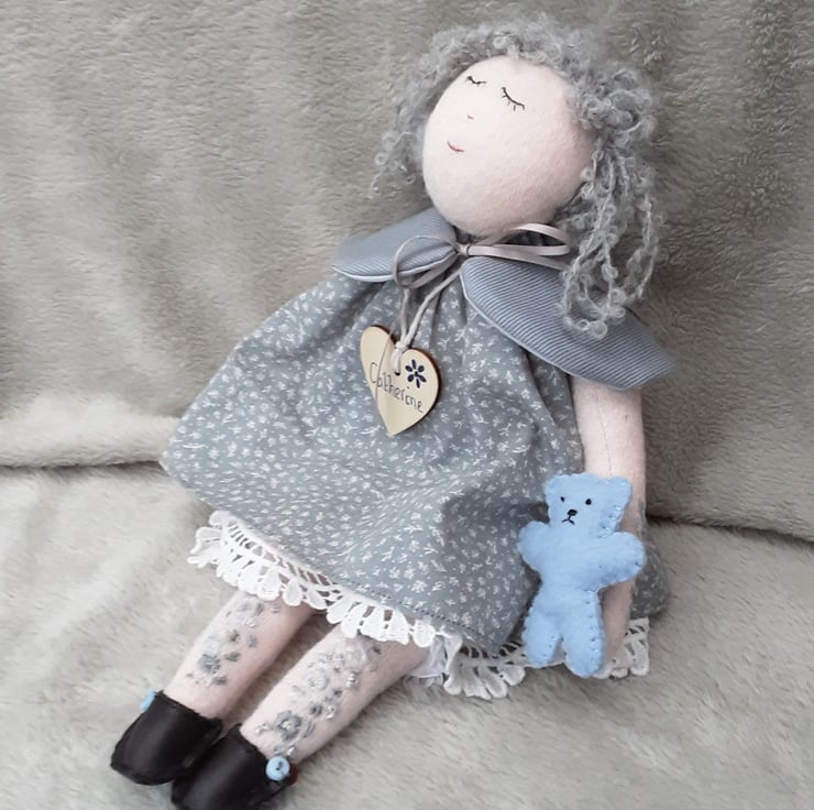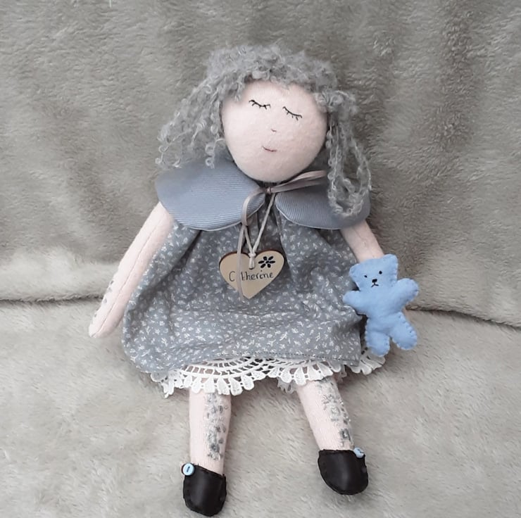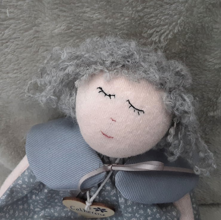 Catherine is a beautiful unique little doll, standing at approx 14" tall and handmade from doll velour fabric in doll face pink.