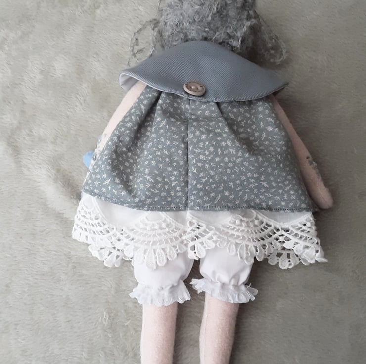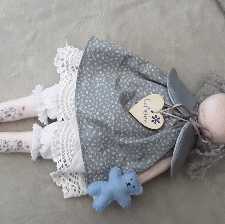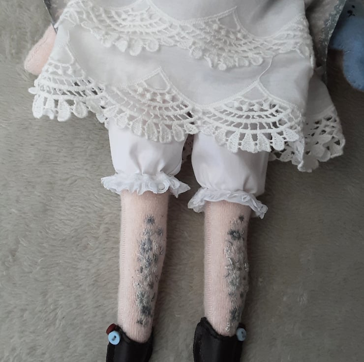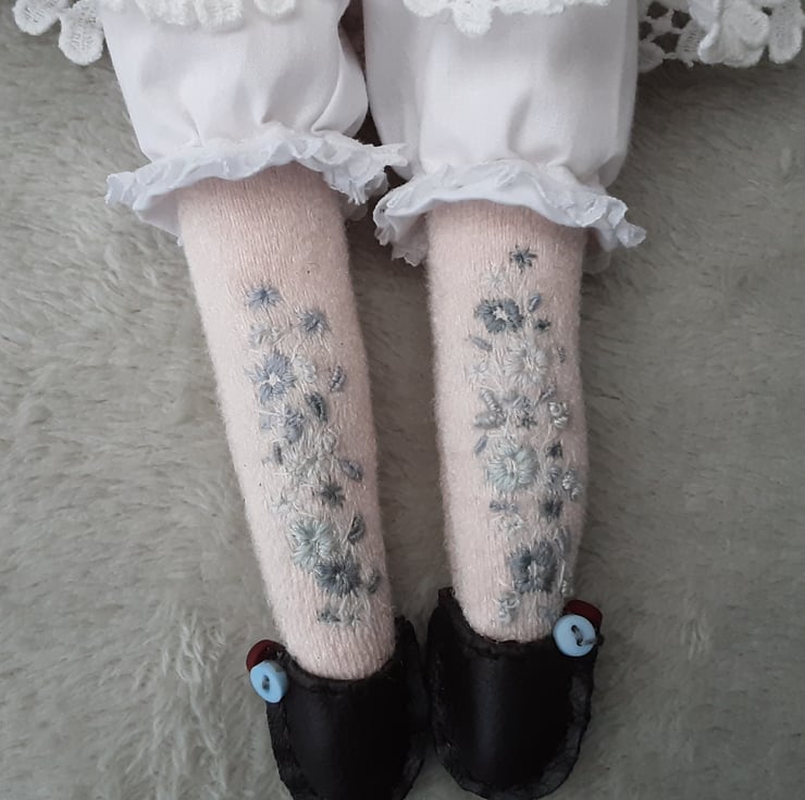 Beautifully embellished, her legs and arms have hand embroidered floral designs in blues and pale greys.