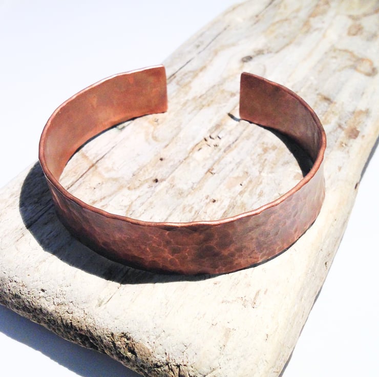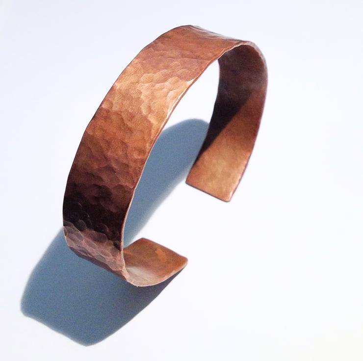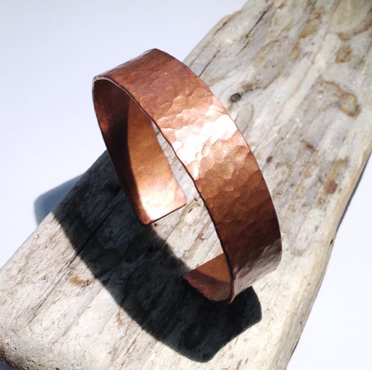 I have made this cuff bangle from copper measuring 18 cm long which has been given an interesting ball hammered finish. It has been oxidised and rubbed back to give an antiqued style finish.
